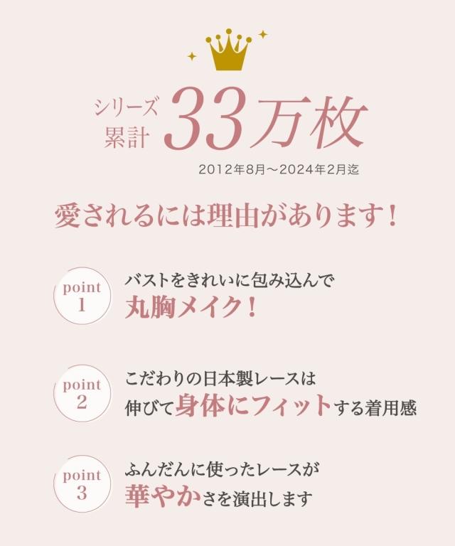 カラフルなカラーと繊細な刺しゅう、着け心地のよさで人気のロングセラーフルカップ。カップの素材を柔らかく伸びがいいものに変え、バストトップの“とがり”を改善。より自然で丸みのあるバストラインをつくります。日本製レースが美しい。