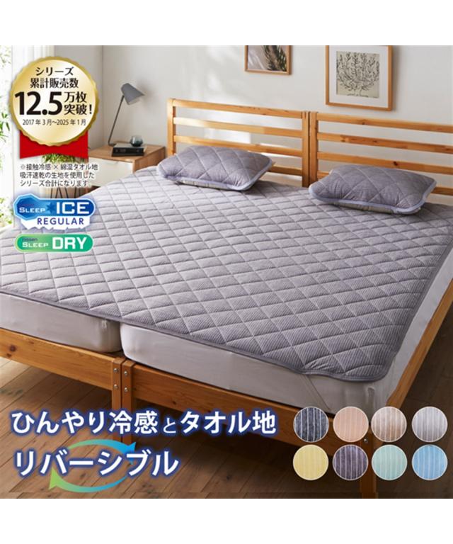 片面はひんやり冷感素材ともう片面は綿混タオル地素材を使用したリバーシブルタイプの敷きパッド。また今年は両面吸汗速乾機能をプラスしての登場です。1枚で2役のリバーシブルタイプの敷きパッドは春〜秋にかけてより快適に夜を過ごして頂けます。