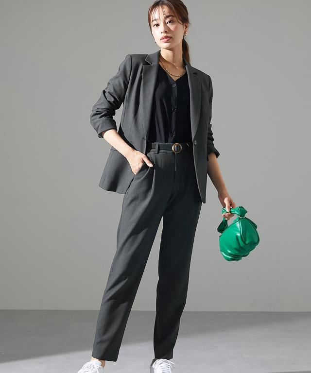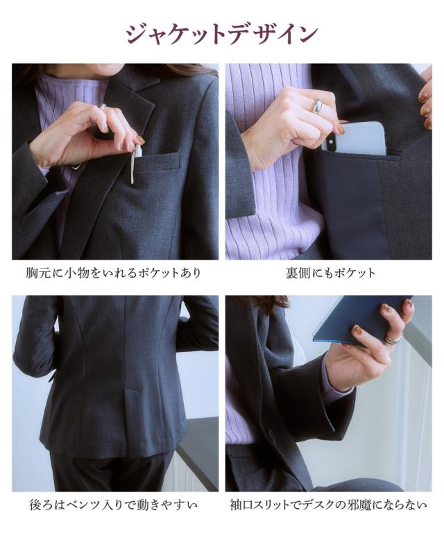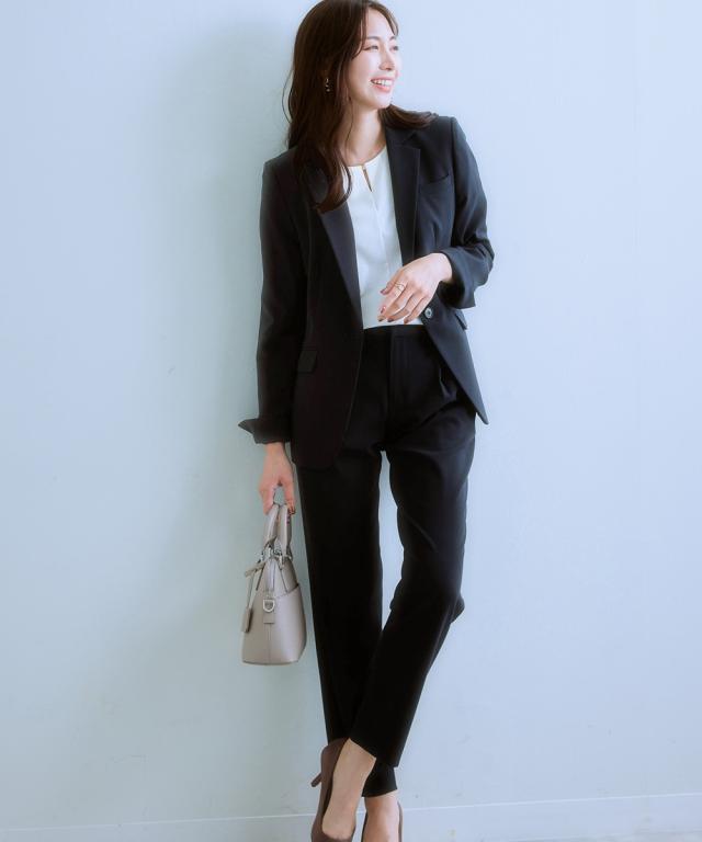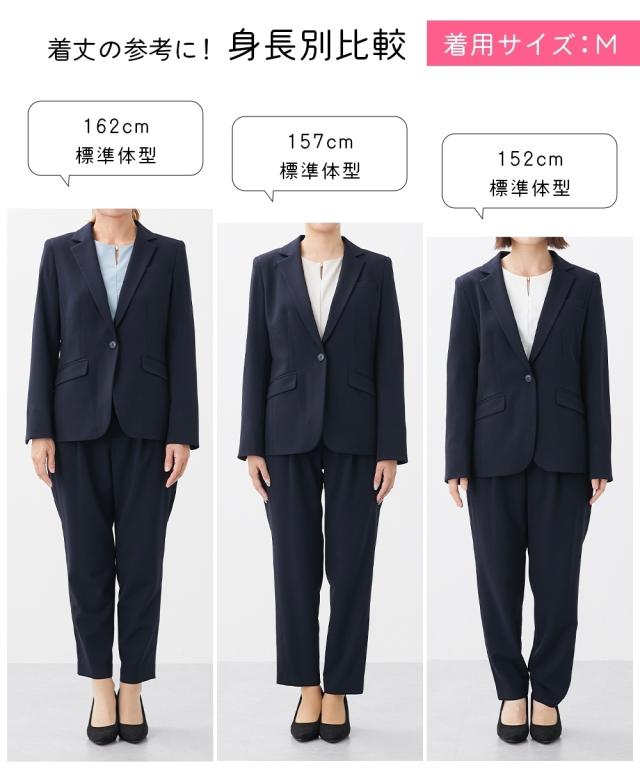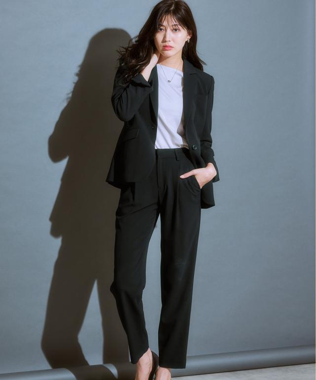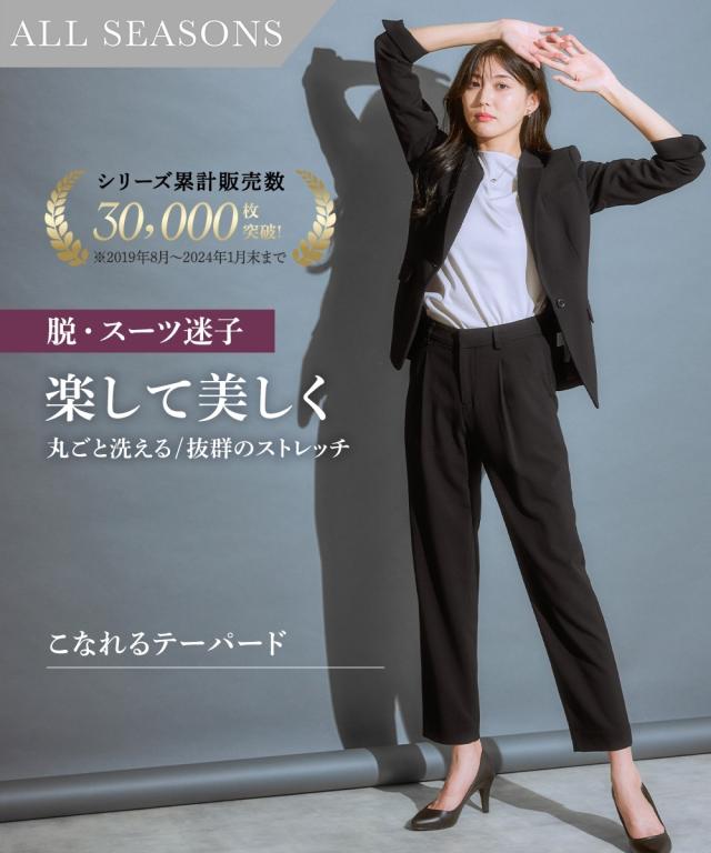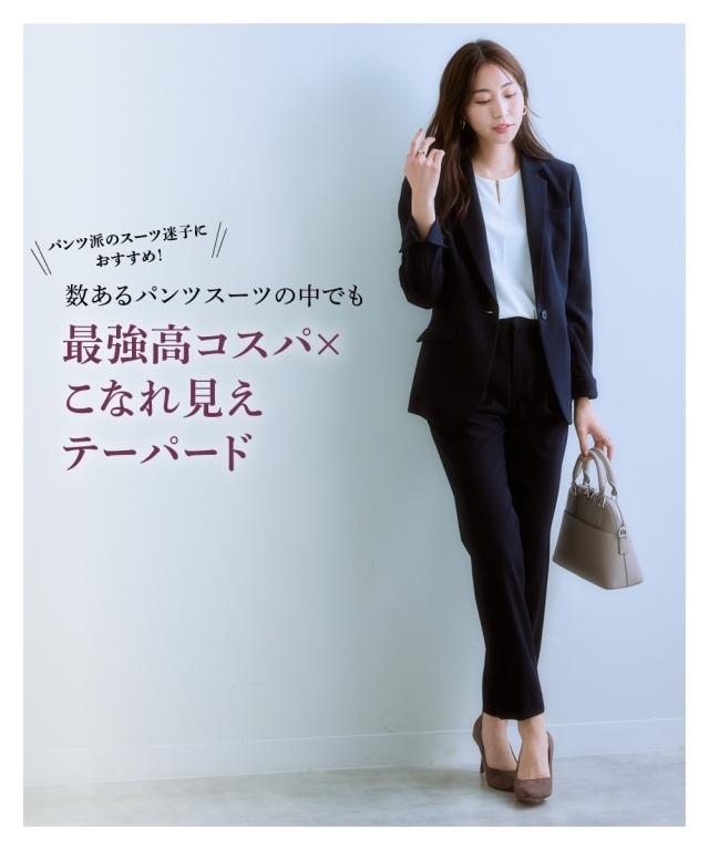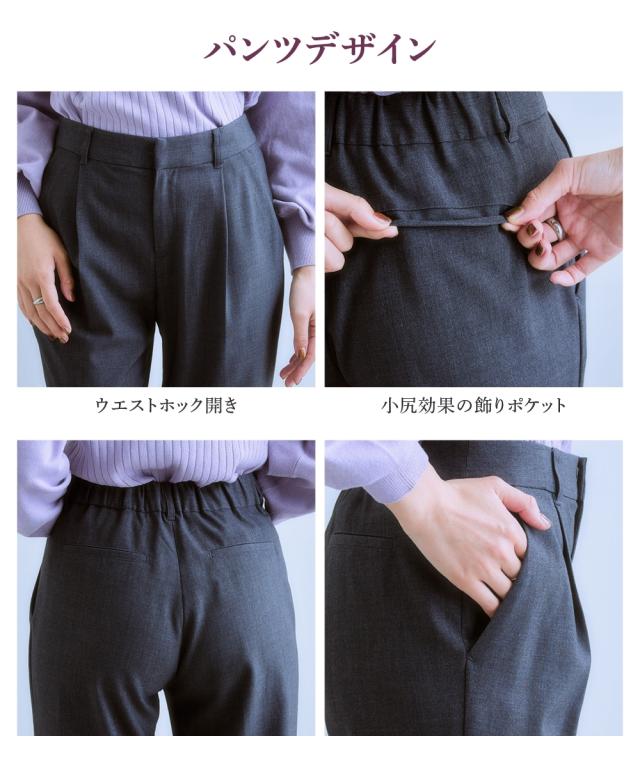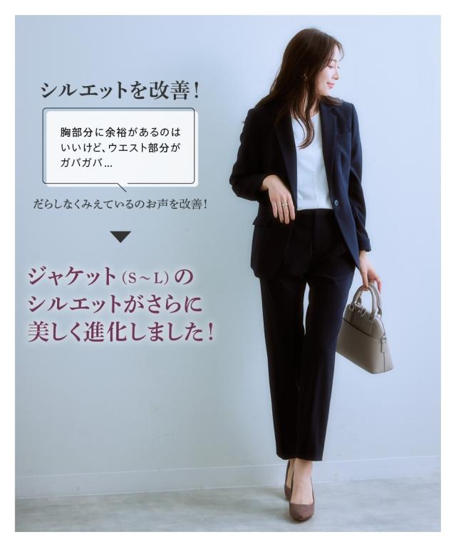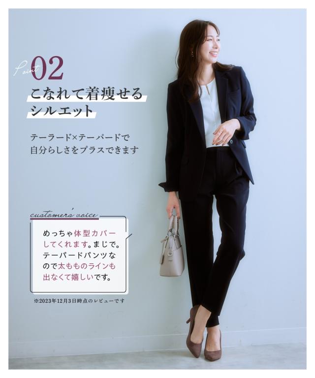 ★人気の商品がアップデート☆より「きれいに見える」パターン設計に!! タテヨコストレッチ素材で着心地ラクチン☆ロングシーズン活躍!家庭で洗える! 足首見せですらりと見えるテーパードパンツのプチプラセットスーツ・スーツ通勤の着回しバリエにオススメ!1着は持っていたい定番シルエットのパンツスーツ! ・ロングシーズンご着用いただけるようパンツは裏地無し、ジャケットは背抜き裏地仕様にしております。 袖裏はすべりをよくするために裏地を付けた仕様です。・パンツのウエストは後ろゴム入りなので着心地ラクチン。・ジャケット
