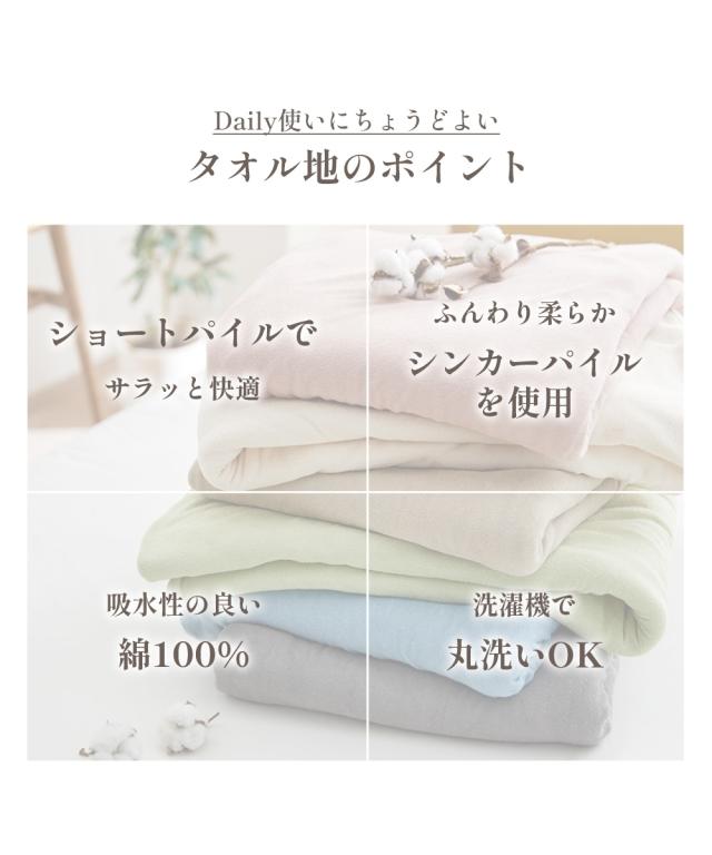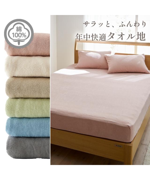 タオル地が好き!というあなたに、お勧めのシーツです。パイル部分は綿100%でとても気持ちが良く、多色展開なので、好きな色がきっと見つかるはず!タオル地素材は年中快適に使用できる寝具としておススメの素材です。