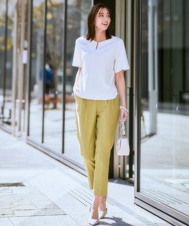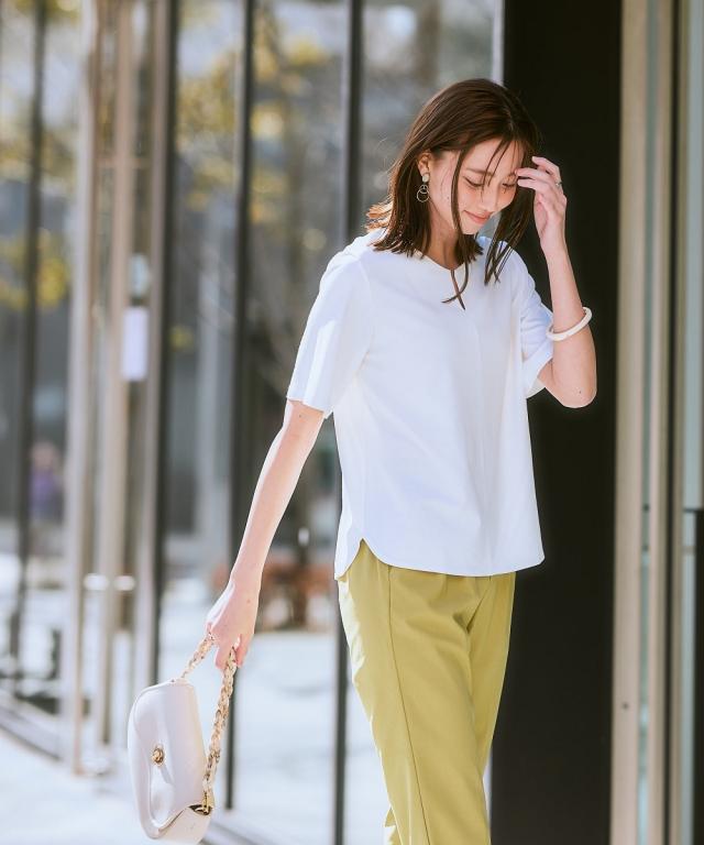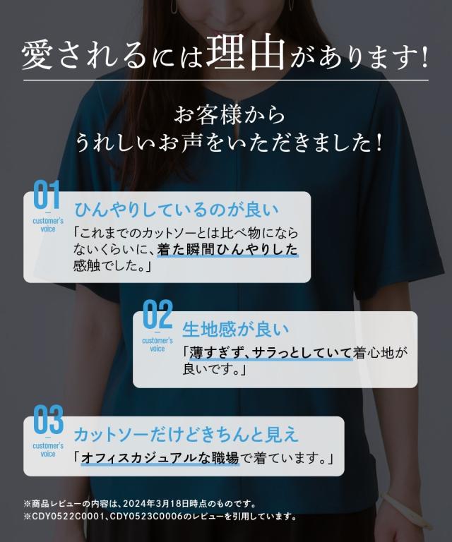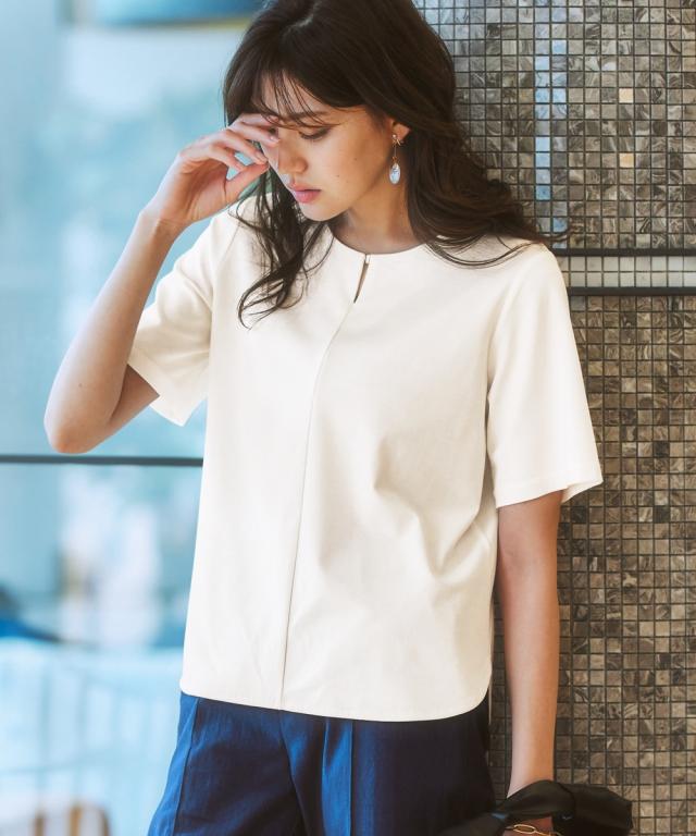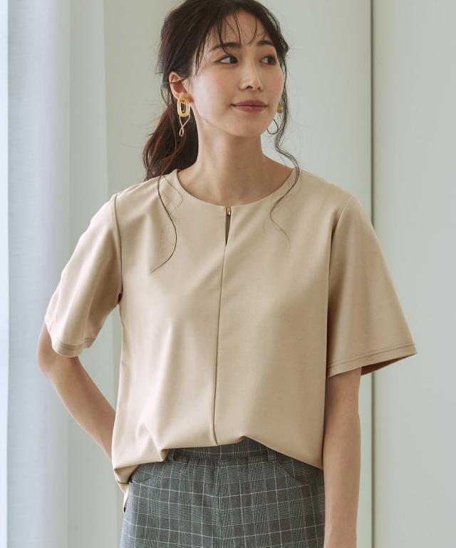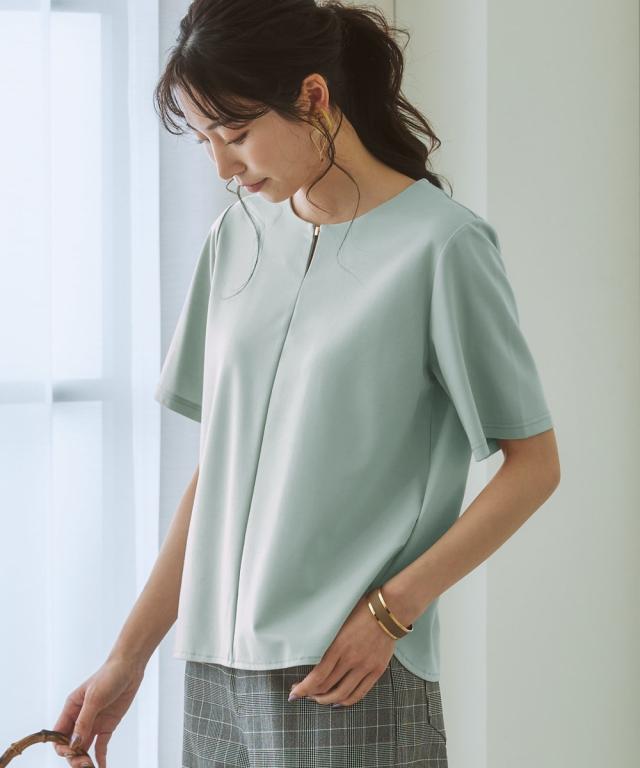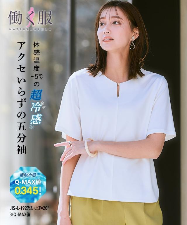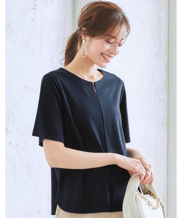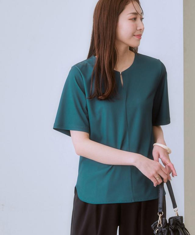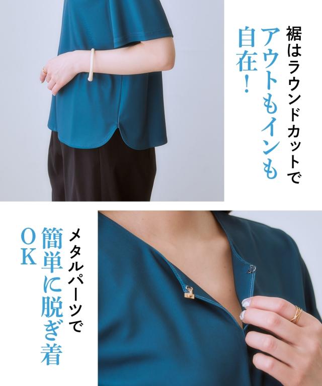 [keyword] レディース ファッション 女性 大きいサイズ ぽっちゃり ふくよか プラスサイズ ラージ 標準サイズ 普通サイズ ゆったりサイズ [comment] 「ひんやり接触冷感」がきいたトップス。ポンチ素材のシルキーな表面感で、とろみ感があるのに体に張り付かない滑らかな肌触り。お腹まわりや二の腕をさりげなくカバーしてくれるシルエットです。Vゾーンのゴールドホックが、印象に華やぎを添え、外せることで着脱もしやすいのが嬉しいポイント。