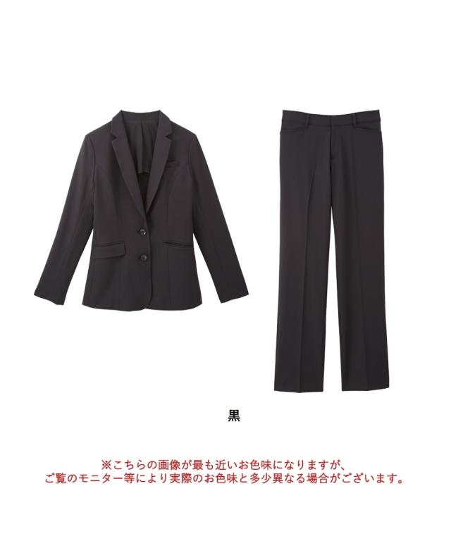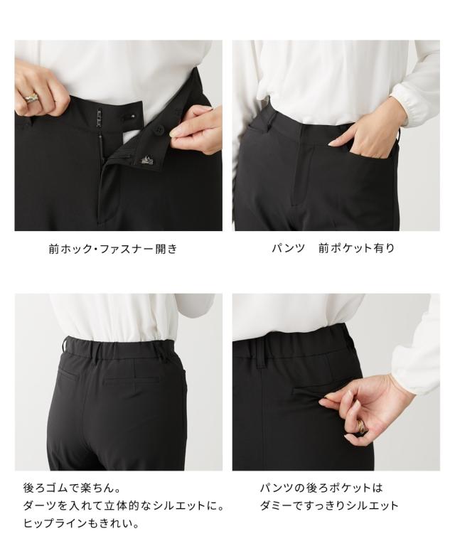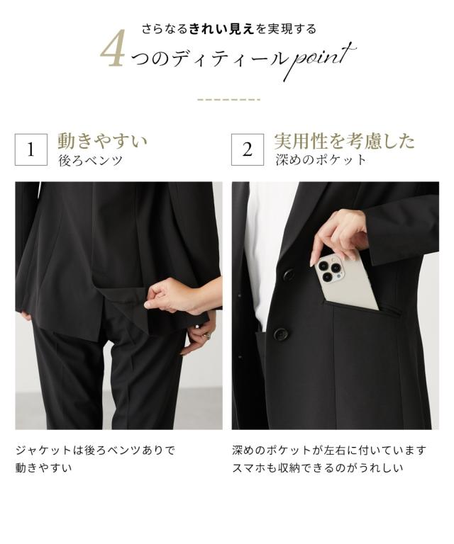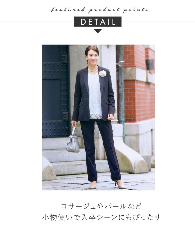 品質=【ジャケット】[表地]ポリエステル95%・ポリウレタン5%[裏地]ポリエステル100% 【パンツ】ポリエステル95%・ポリウレタン5% 【ジャケット】[裏地]有(背抜き) 前ボタン開き 袖口・後中心ベンツ ポケット前2つ・左胸・内ポケット 肩パッド付 ジャケットは5面体設計で、より無理なく身体にフィットするよう工夫をしています。【パンツ】[裏地]無 前ホック・ファスナー開き ポケット前2つ・後ろ飾りポケット ウエスト後ゴム入 ※この商品は2点同サイズのみで販売します。 原産国:中国製 洗濯表示:洗濯