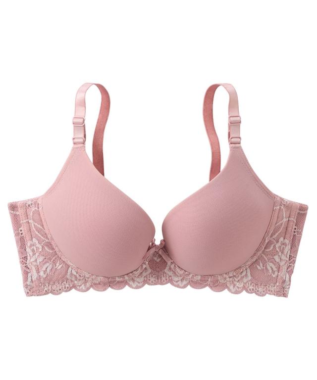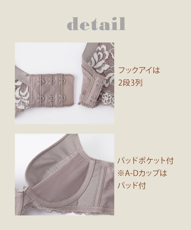 品質=ナイロン・ポリウレタン・その他もしくは ナイロン・レーヨン・その他 3/4カップ ワイヤーなし サイドボーン入り 後ホック2段3列 A〜Dカップはパッド入り(取り外し可) E・Fカップはパッドなし ※レース柄がカラーによって異なります。 原産国:中国製 備考:手洗い ※お洗濯は、必ず取り扱い表示にしたがってください。