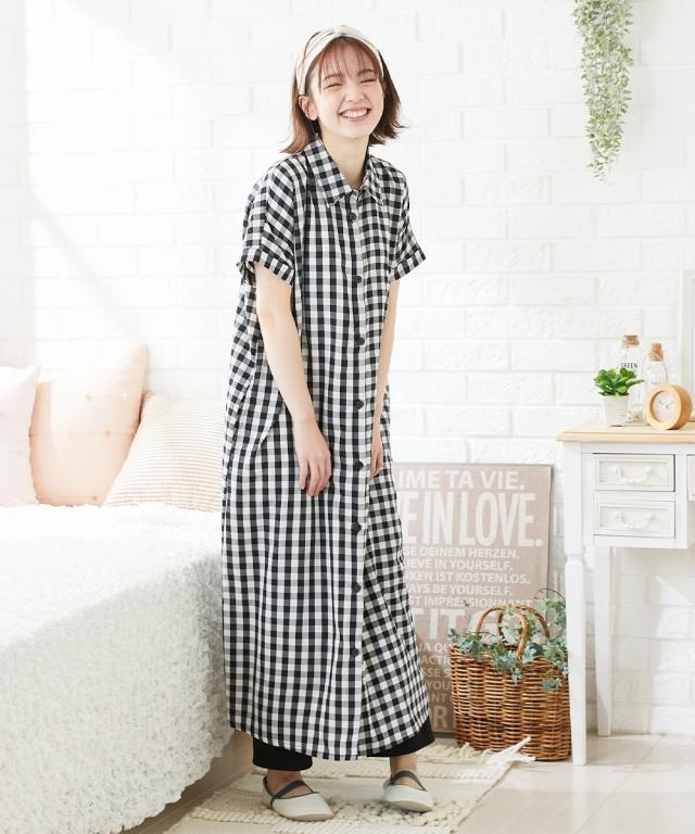 【産前・産後 授乳服】先染め シャツワンピとしても使えるマタニティ半袖パジャマ(ワンピース+パンツ)