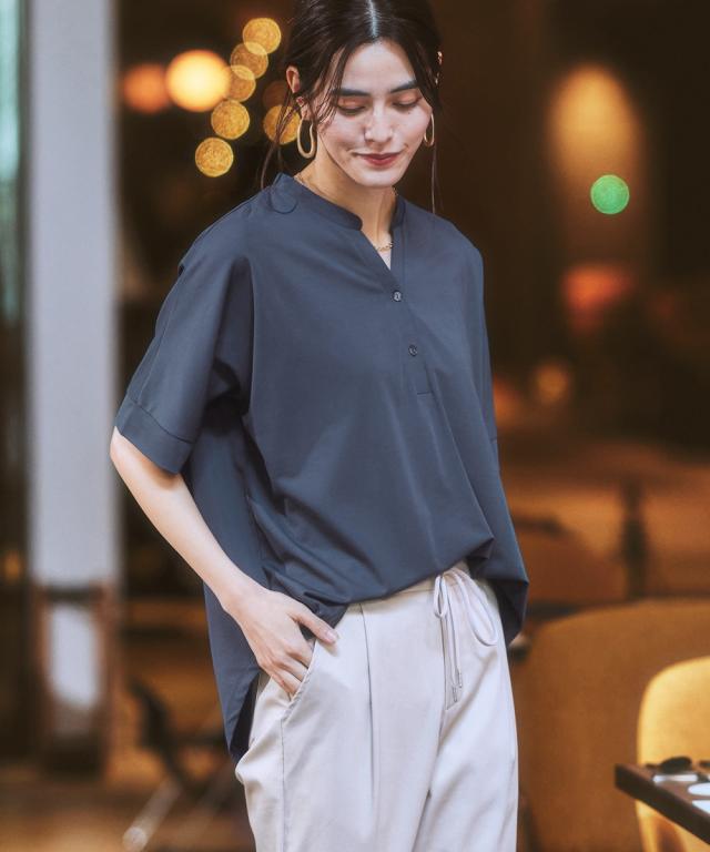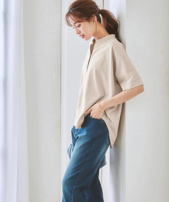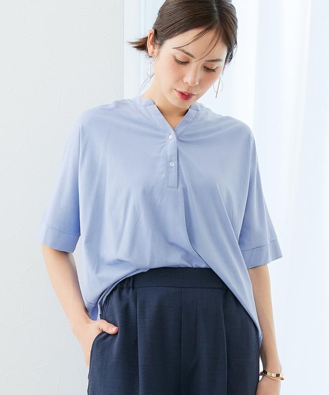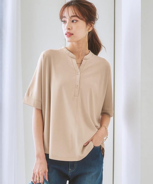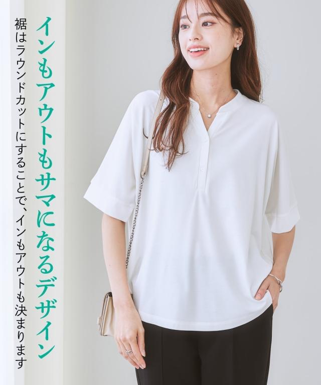 [keyword] レディースファッション 標準サイズ 普通サイズ ふつう丈 おしゃれ 半袖 五分袖 Vネック 洗濯機洗いOK 洗濯 接触冷感 ひんやり 夏 カットソー 無地 無地調 柄 かわいい ベーシック シンプル 定番 着回し オフィスに最適 オフィス ビジネス 仕事 通勤 きれいめ [comment] 着た瞬間ひんやり接触冷感で、シルキーなカットソーポンチ素材。すっきりVゾーン、二の腕や肘をカバーするドルマンシルエット、背中はのっぺり感を解消するバックギャザーが入っています。