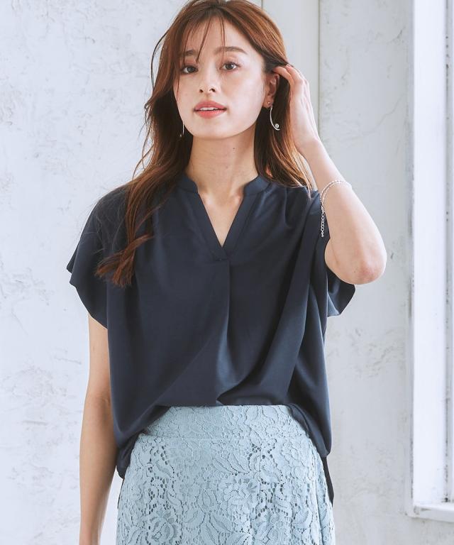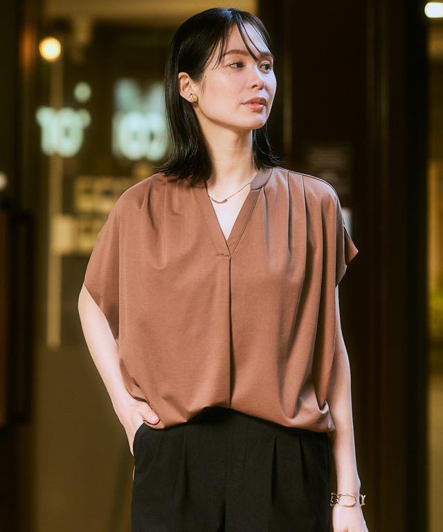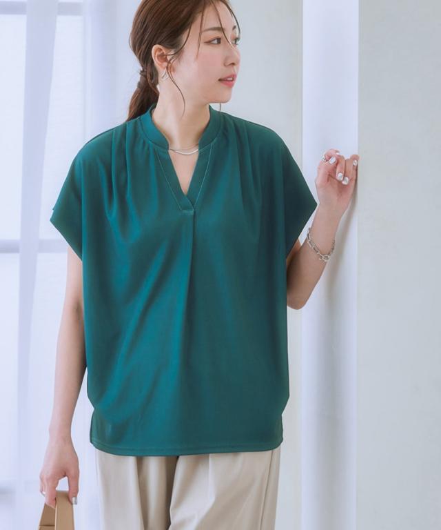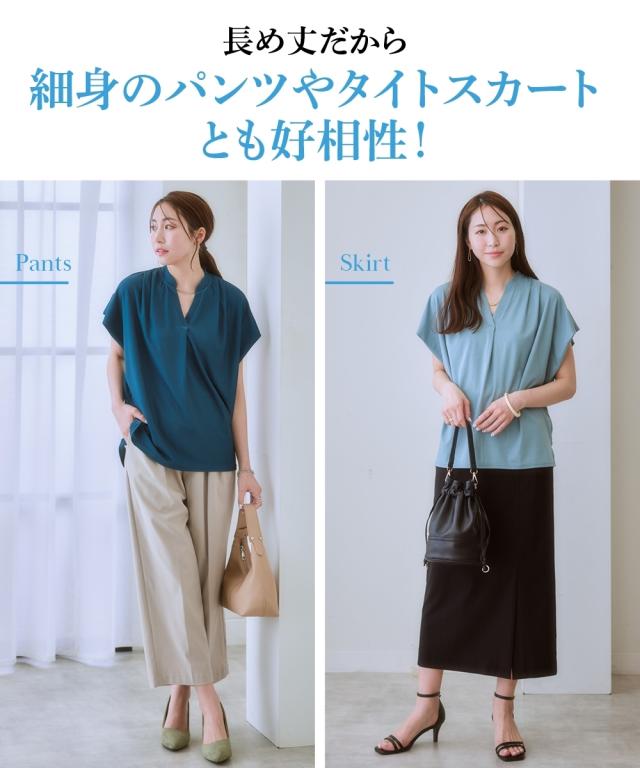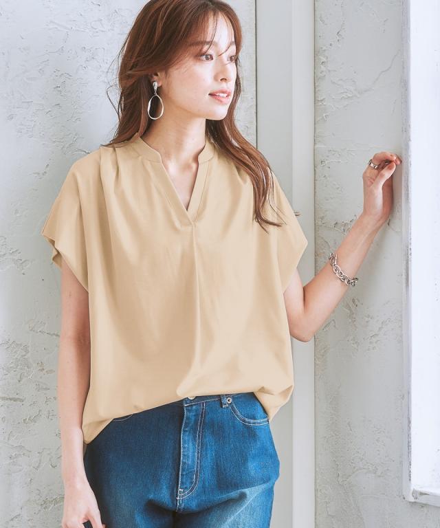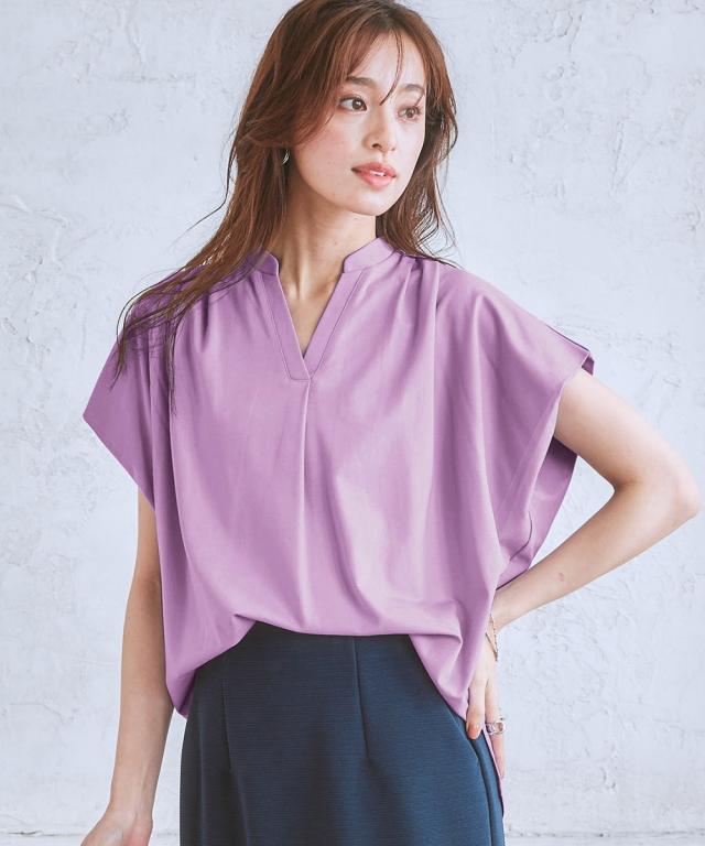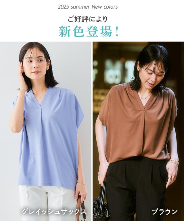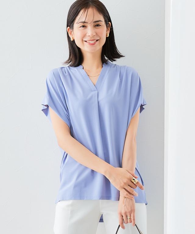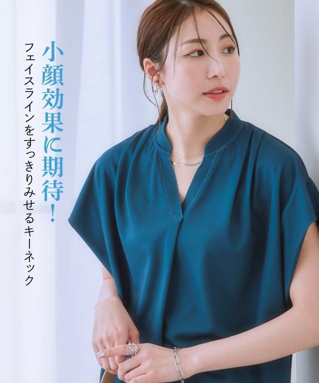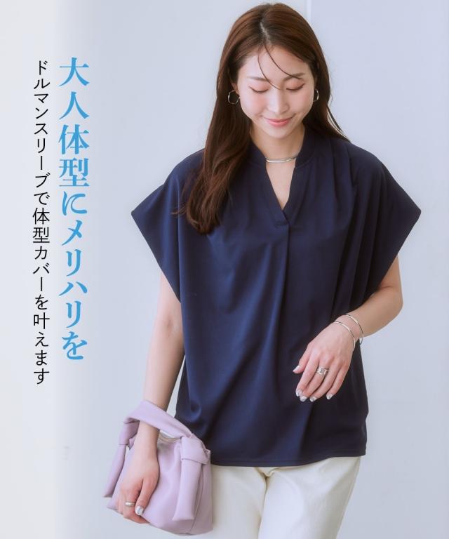 [keyword] レディース ファッション 女性 大きいサイズ ぽっちゃり ふくよか プラスサイズ ラージ 標準サイズ 普通サイズ [comment] シルキーな表面感でブラウス級の見た目を実現するカットソーポンチ素材。身体に張り付かず、なめらかな肌触りが特徴です。キーネック衿がシャープな印象のトップスは、肩のタックでおしゃれ感もさりげなく。華奢見えするシルエットです。