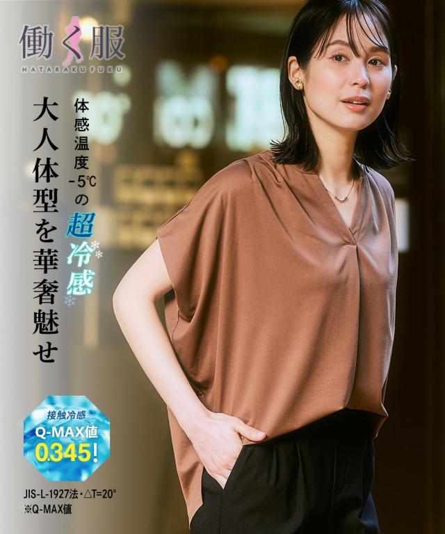 シルキーな表面感でブラウス級の見た目を実現するカットソーポンチ素材。身体に張り付かず、なめらかな肌触りが特徴です。キーネック衿がシャープな印象のトップスは、肩のタックでおしゃれ感もさりげなく。華奢見えするシルエットです。
