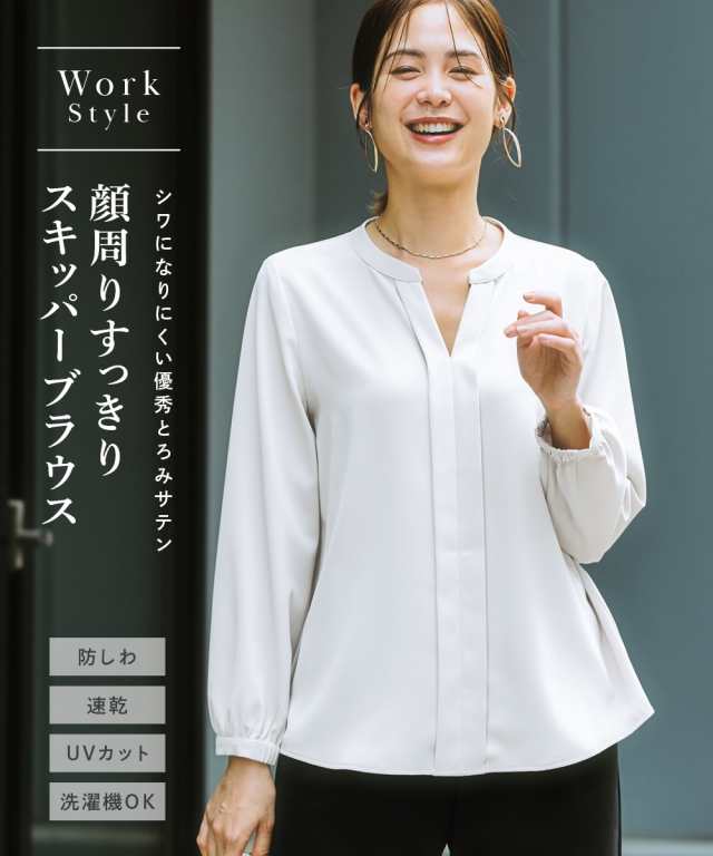 [keyword] レディースファッション 標準サイズ 普通サイズ 長袖 おしゃれ 防しわ アイロン おでかけ 洗濯機洗いOK 洗濯 UVカット 夏 外 イベント 肌 レジャー ストレッチ 伸び [comment] オフィスモニターさん太鼓判!さらっと心地良く、女性らしいとろみ感も兼ね備えたパウダーサテンで仕立てた顔まわりすっきりのスキッパー衿ブラウス ■デザイン ・人気のフロントタックデザインをスキッパー衿にして顔周りすっきり。・背中ののっぺり感を解消するタックデザイン。・プッシュアップしやすい袖口ハーフゴム仕様。・ジャケットインを考えて袖口から出てこない袖丈。 ■素材 とろんと肌の上をすべるなめらかパウダーサテンです。働く女性の毎日をサポートする、「しわになりにくい・速乾・洗濯機OK・UVカット」を兼ね備えた優秀機能素材です。 ■おすすめのスタイリング ・スカートでもパンツでもバランスよく着用いただけます。小物を変えて、フォーマルシーンにも活躍。