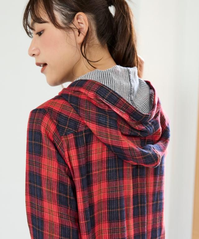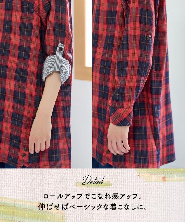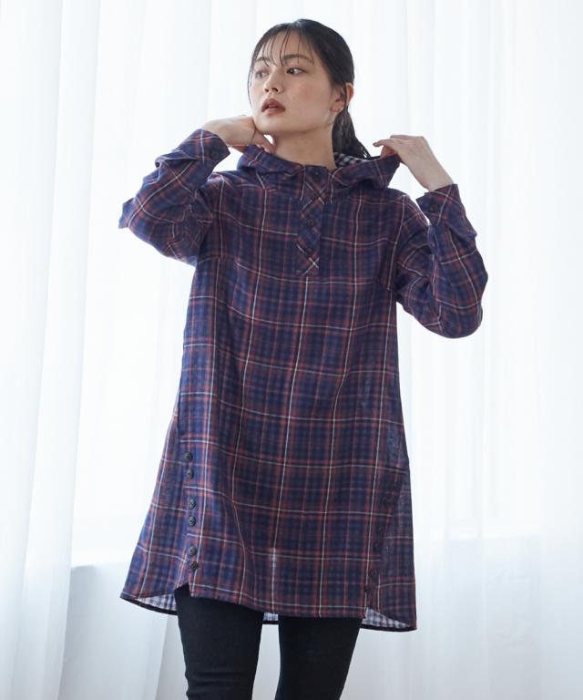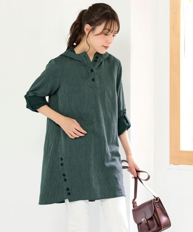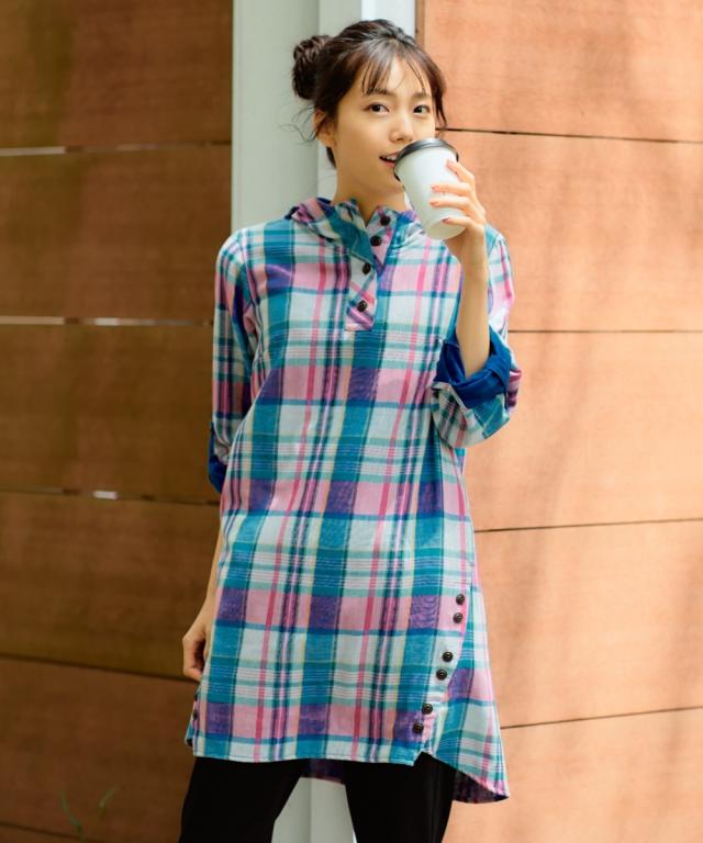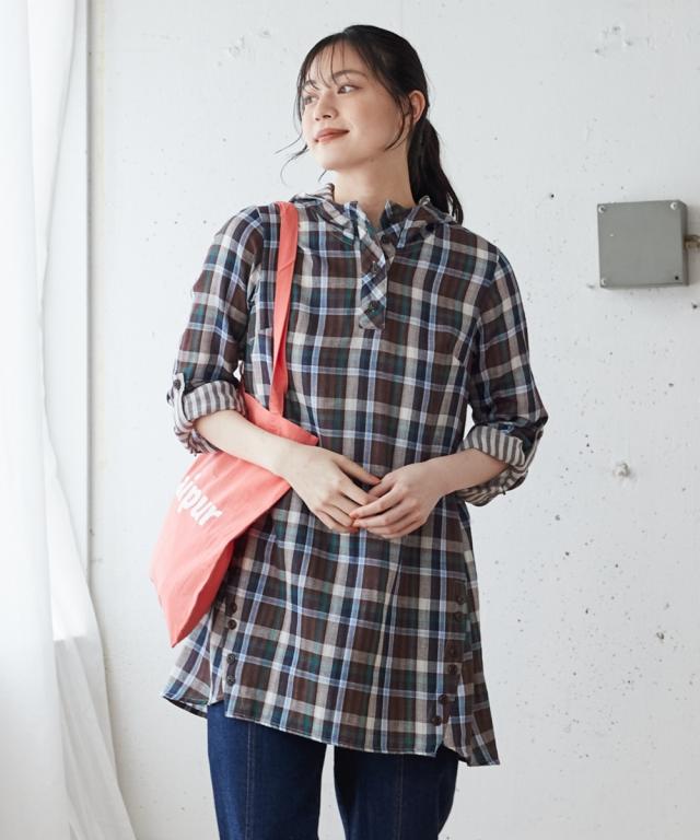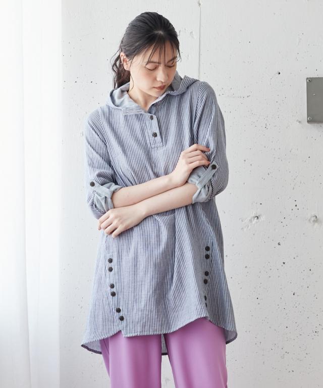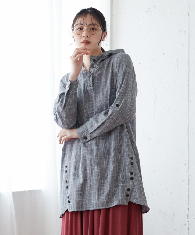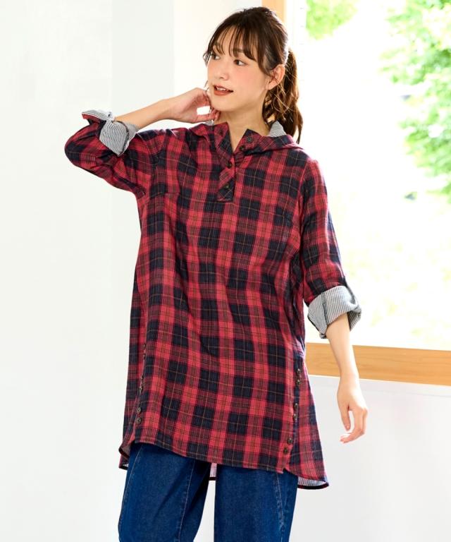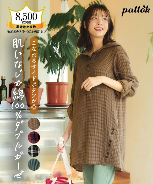 大きいサイズ綿100%肌触り爽かダブルガーゼフード付チュニックブラウス