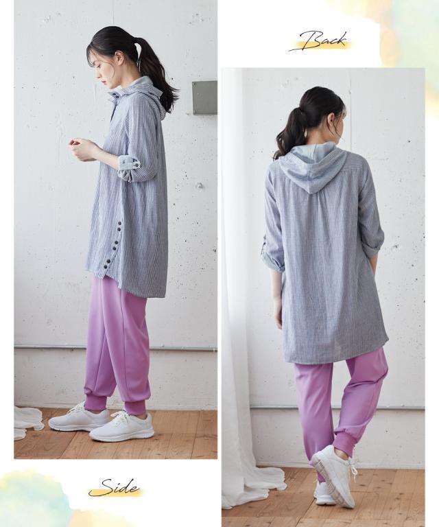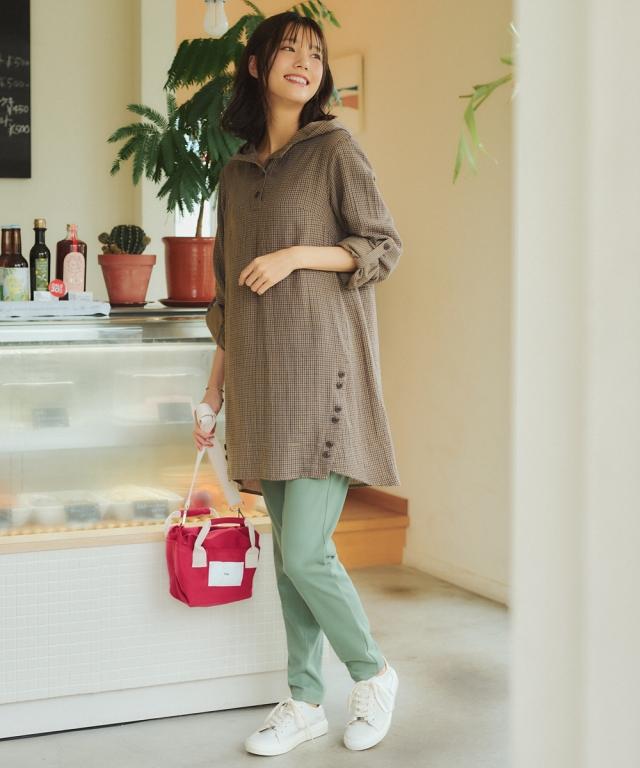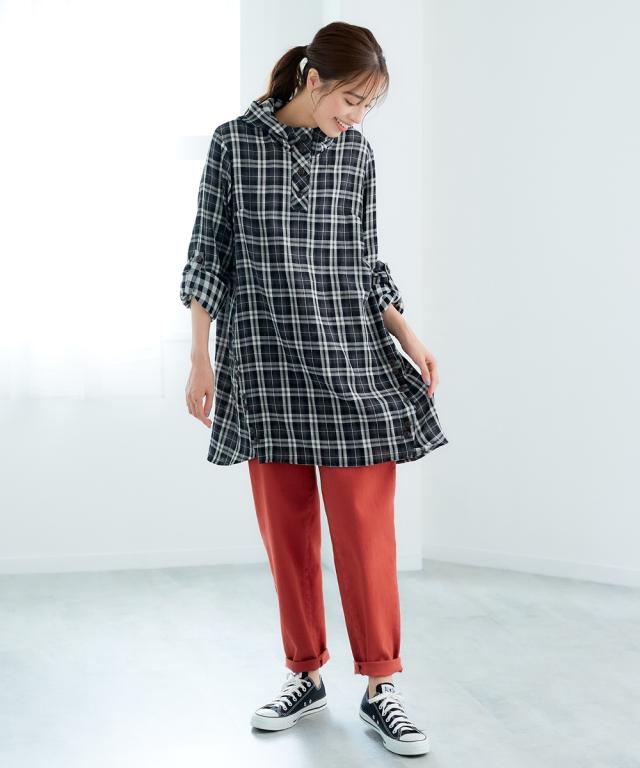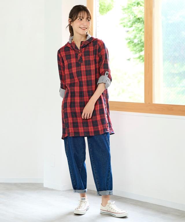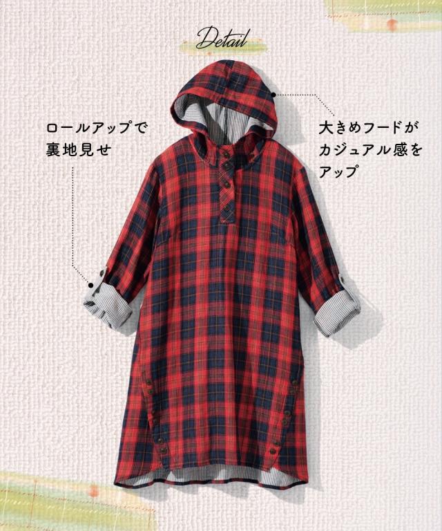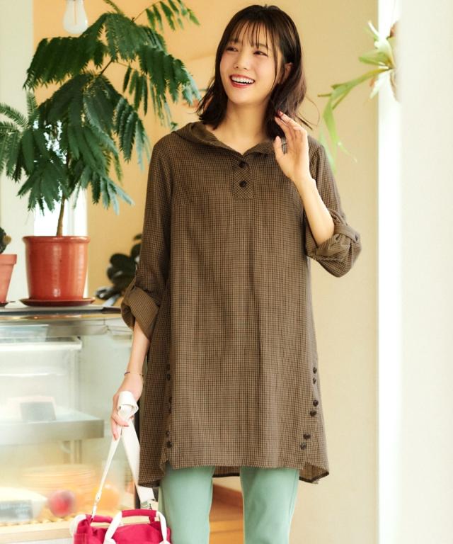 まだ暑いこの時期にピッタリ!お肌に優しい綿100%ダブルガーゼチュニック。 ■デザイン フードや袖口をロールアップすると裏の配色が見えて可愛い1枚。脇から斜めにはしるボタン使いがスッキリ見せてくれます。袖はロールアップ仕様なので暑い時期から着用でき、長く使えます。気になる腰回りをカバーしてくれる優秀アイテム。 ■素材 綿100%の肌触りの良い柔らかなダブルガーゼ素材なので汗をかいても爽やかな着心地です。 ■おすすめのスタイリング 1枚でシンプルに細身のパンツを合わせる王道の着こなしはもちろん、ロングスカートやワイドパンツと合わせても可愛くてお勧めです
