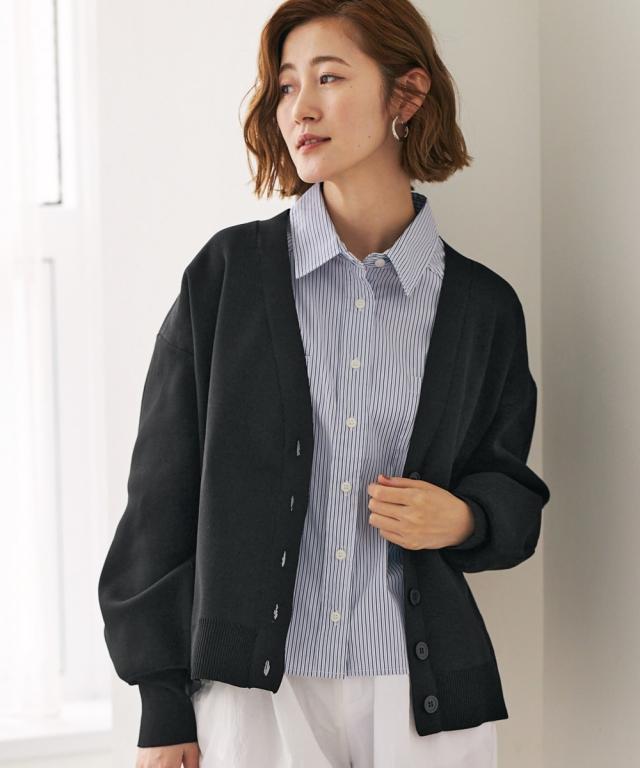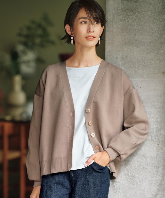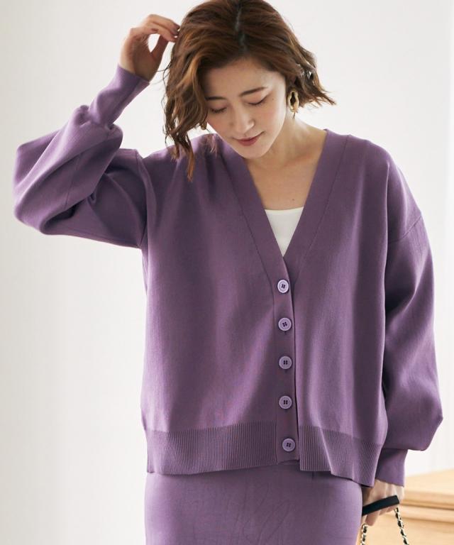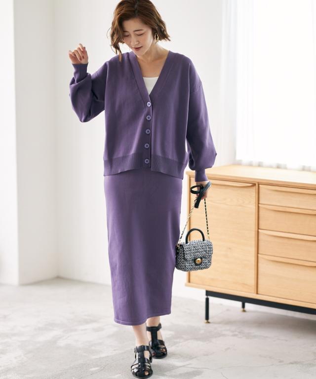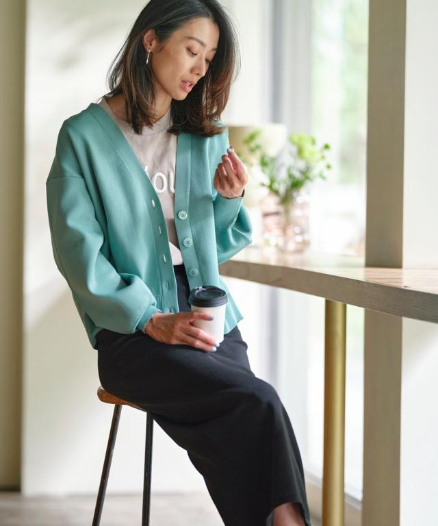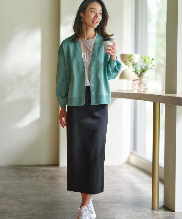 ハリがあって体型を拾いにくく、洗っても型崩れしにくいお手入れもラクなカーディガンです。 同素材のスカートとのセットアップでシンプルコーデの完成!