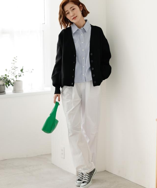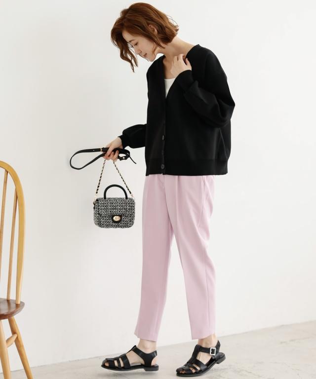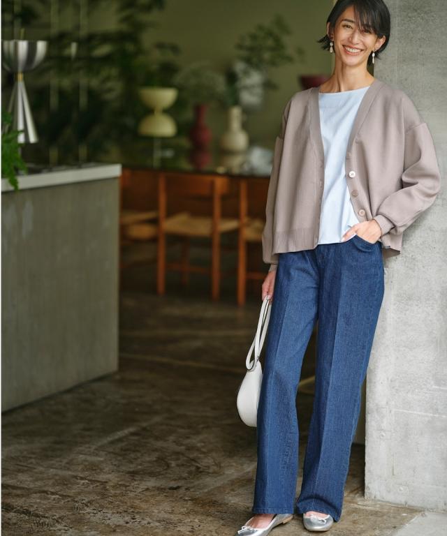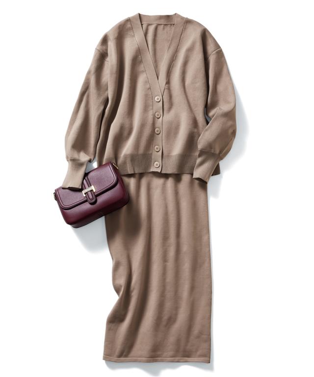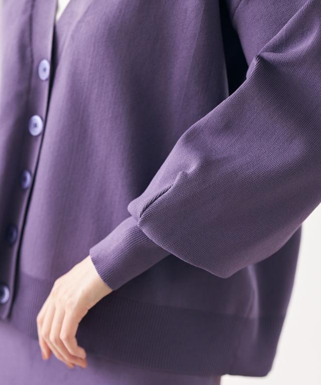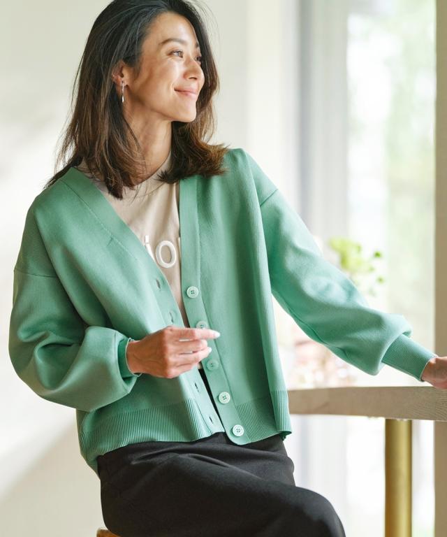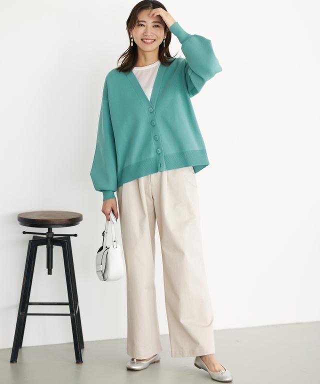 ハリがあって体型を拾いにくく、洗っても型崩れしにくいお手入れもラクなカーディガンです。 同素材のスカートとのセットアップでシンプルコーデの完成!