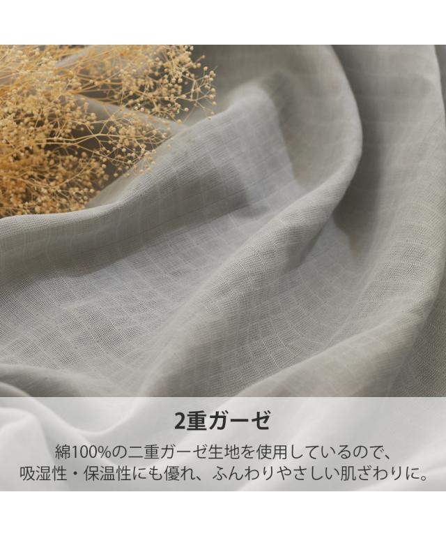 綿100% 2重ガーゼ。ふんわり優しく心地良い抗菌防臭加工でいつも清潔。年中快適にお使いいただけます。天然素材の綿100%ガーゼを2重に重ねてふんわり柔らかく心地よい肌触りを実現。綿素材は化学繊維と比べて優れた吸水性があるのも特徴です。吸水した水分は外に発散されるので通気性がよく年中快適にお使いいただけます。