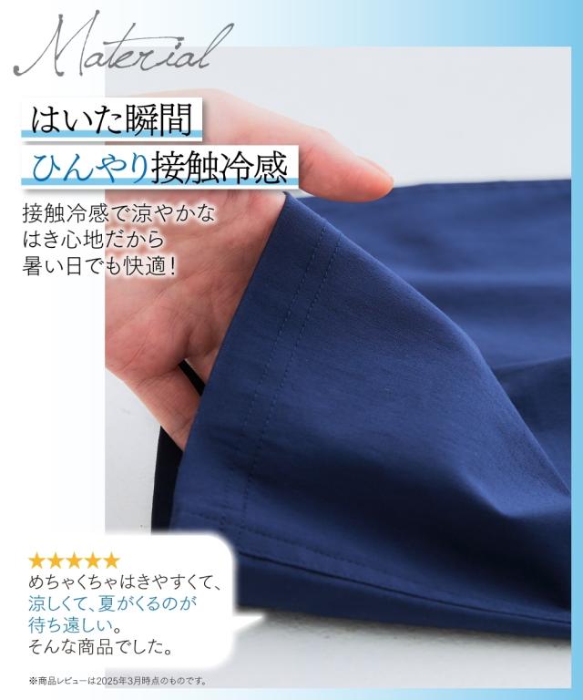 接触冷感素材で、履いた瞬間ひんやり涼やかなはき心地だから、汗ばむ日でもさらっと心地よい。