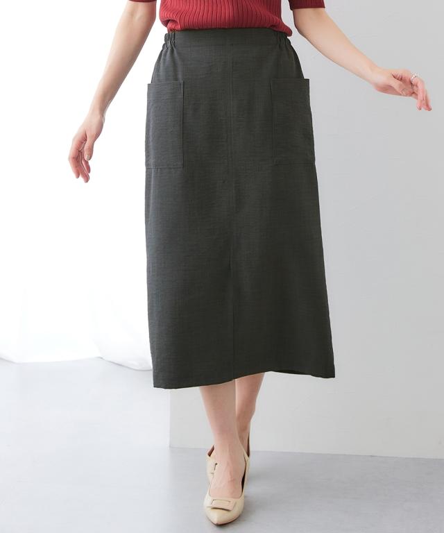 【トレンド感たっぷり!美形なIラインスカート】歩きやすく涼やかに履ける、フロントスリット入り。■ポイント・夏におすすめの麻調合織でオンからオフまで着まわせるカセット服。・上下セットはもちろん、単品でもお仕事コーデに便利なアイテムを揃えた。・着回しできる、シワが気になりにくい。■デザイン・大きめポケットやほんのりとしたIラインがトレンド感たっぷり。・ウエスト総ゴムで快適な履き心地。・足さばきが楽ちんなフロントスリット入り。■素材・見た目も着心地も涼やかな、シャリ感のあるリネンライク素材。・接触冷感でしわになりにくい、高機能な麻調合織。・初夏から大活躍するUVカット機能付き。・ネットに入れれば洗濯機洗いOKなので、お手入れ楽ちん。■おすすめのスタイリング・同素材のブラウスと合わせてワンピース風に着るのがおすすめ。・シンプルデザインなので、お手持ち服と気軽に合わせて通勤コーデが即完成!