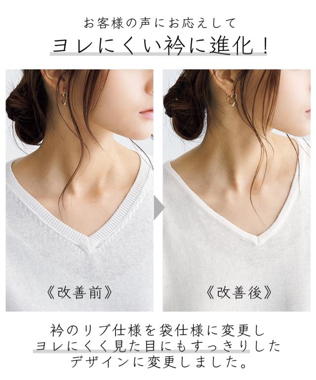 衿のヨレが気になるとのお声にお応えして、ヨレにくく、見た目もスッキリ見せできる袋仕様のネックデザインに改良しました!