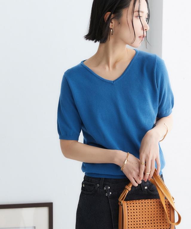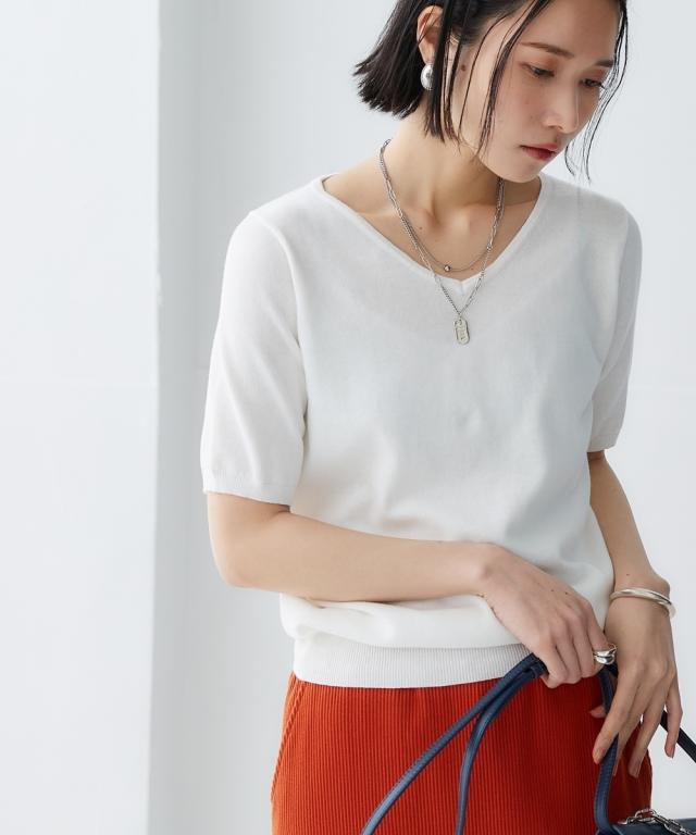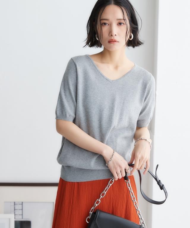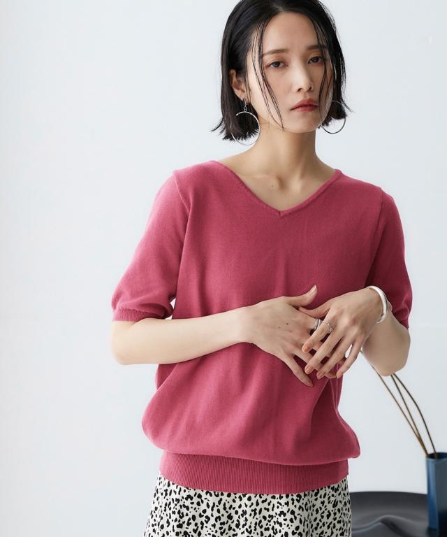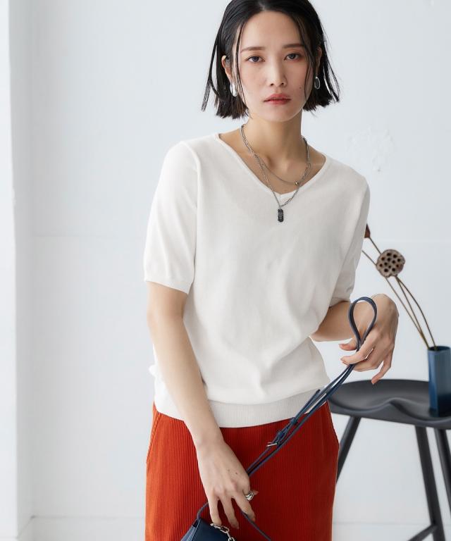 大人の抜け感と小顔効果を発揮するVネックの半袖ニット。