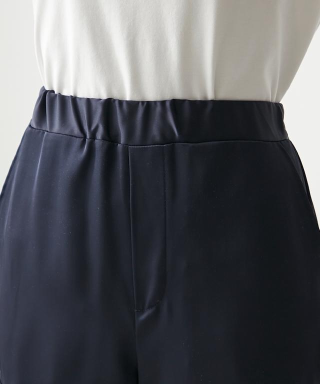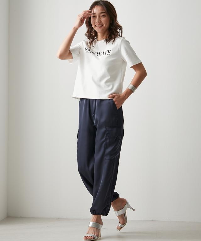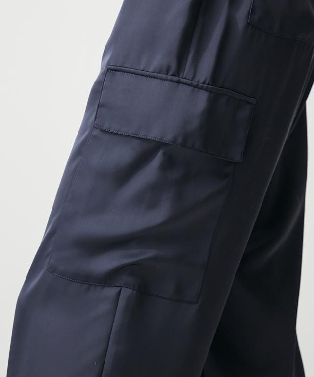 軽くて涼しいサテンパラシュートパンツ。ルーズなシルエットでリラックス感のある穿き心地です。裾のゴムシャーリングはひもが外に見えにくい設計で更に足首をす