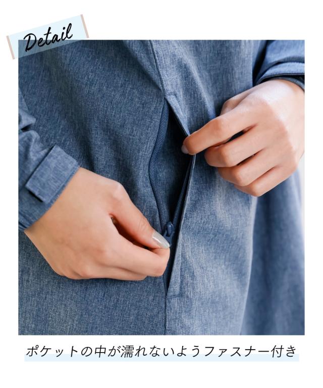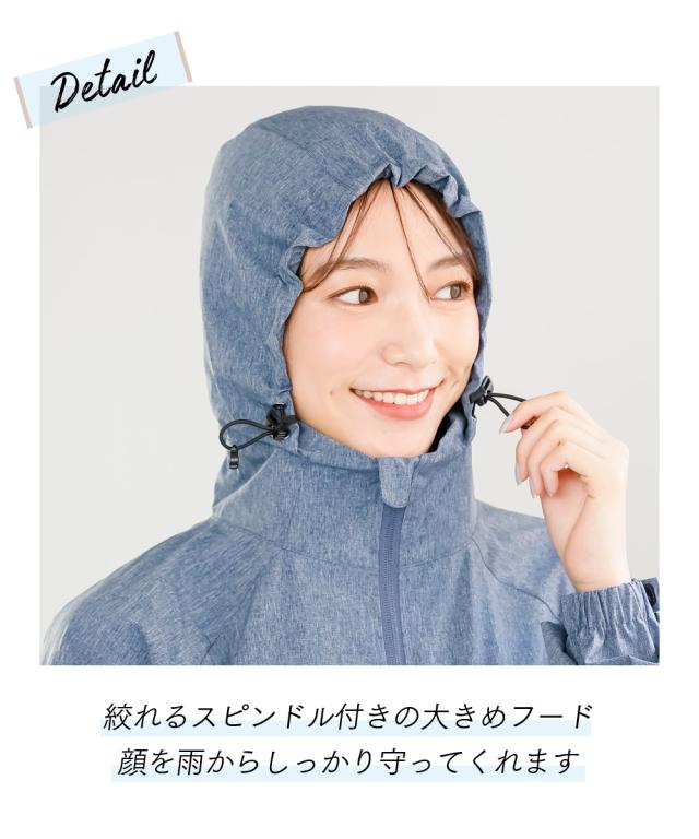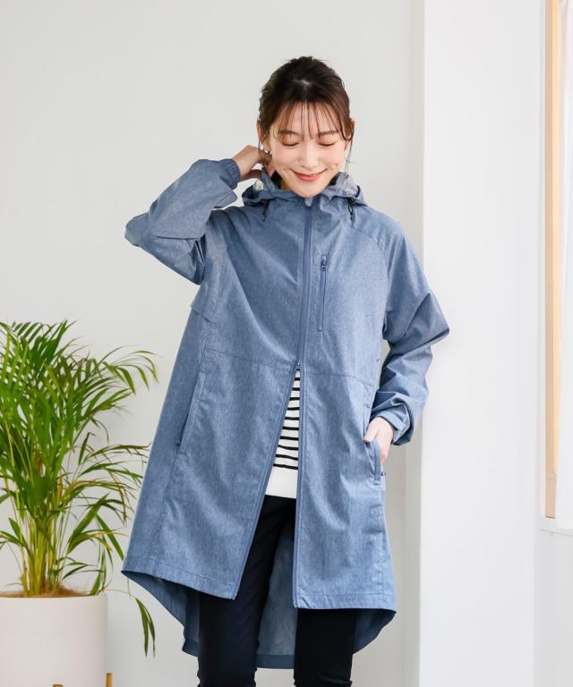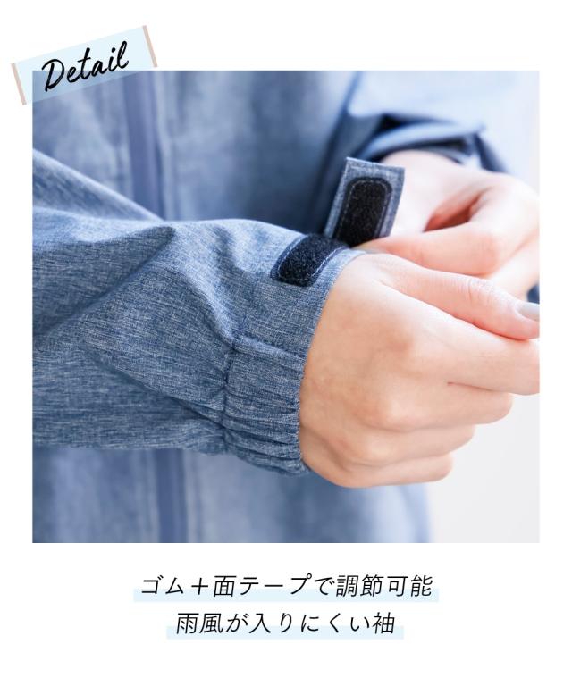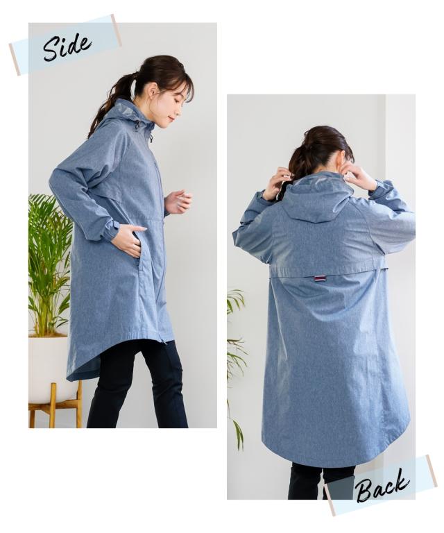 前後差のあるマウンテンパーカー風のある旬なデザインでオシャレにきまります。首が高いので雨も日差しもしっかりガードしてくれます。安心のファスナーガード付き。上からも下からも開閉できるので便利。後ろにはトリコロールのおしゃれな反射板がついているので夜も安心。通気口もついているので風が通るので蒸れずに涼しく着用いただけます。気になる下半身がすっぽり隠れる安心丈。前後差あるのでスッキリ着用いただけます。