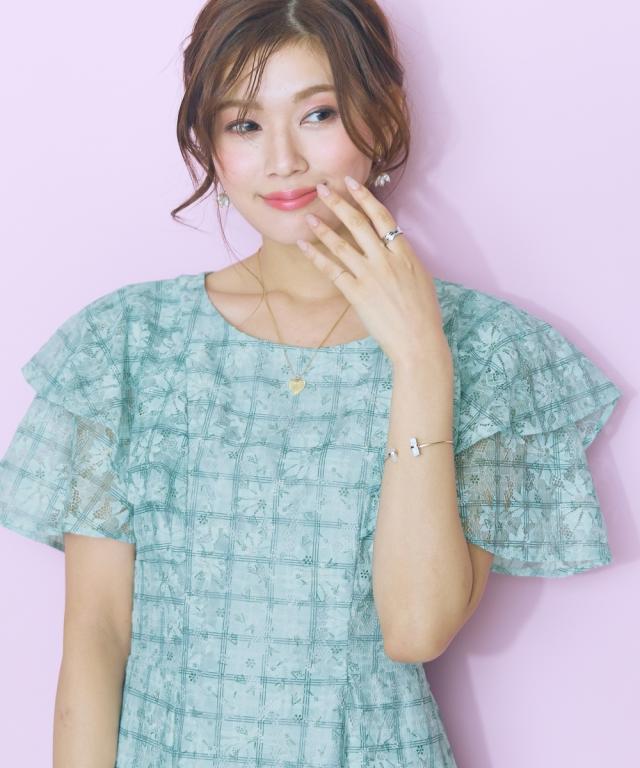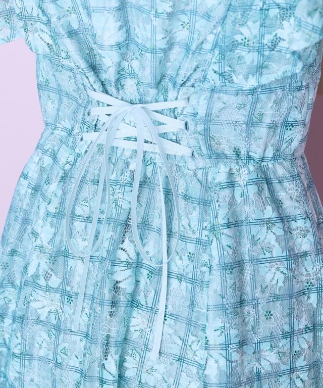 とにかくレース生地が抜群にかわいいワンピースです。袖部分はフリルを重ね、程よい透け感を演出。後ろはグログランリボンの編み上げデザイン。グリーン色はネイビー、ラベンダー色はグレーの配色デザインになっています。