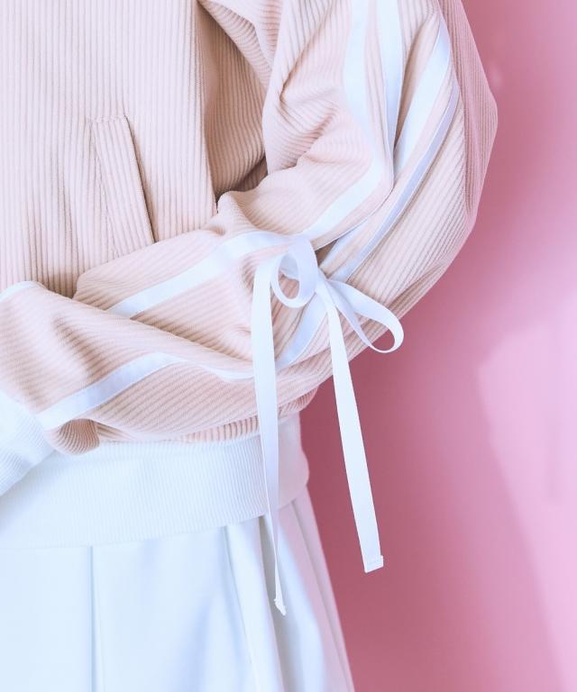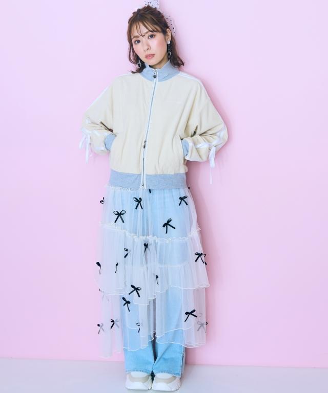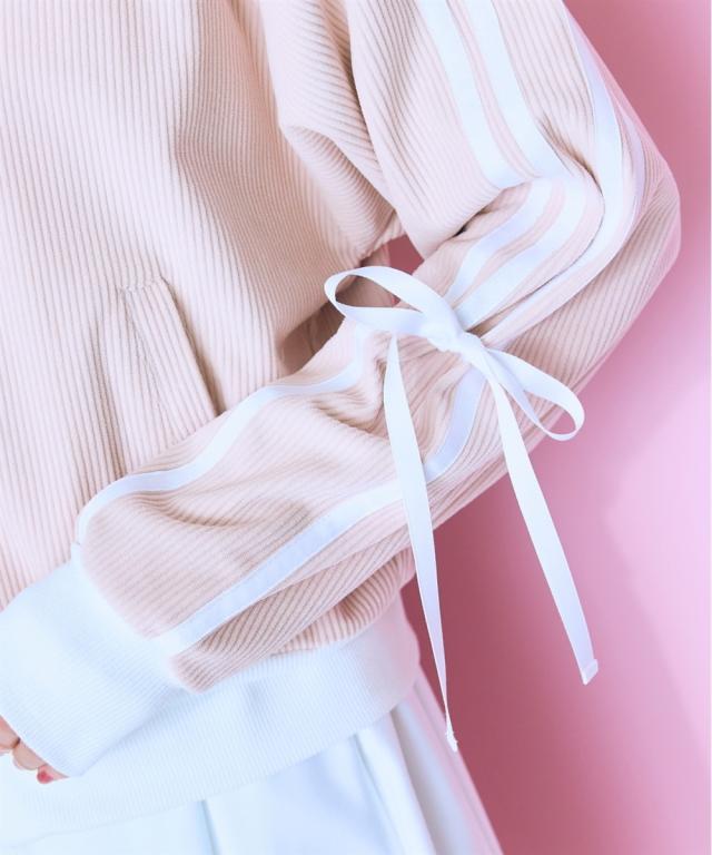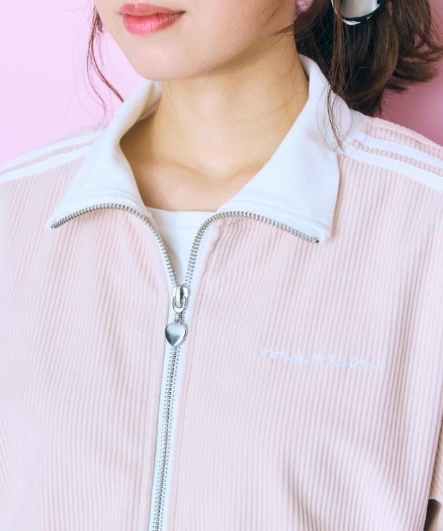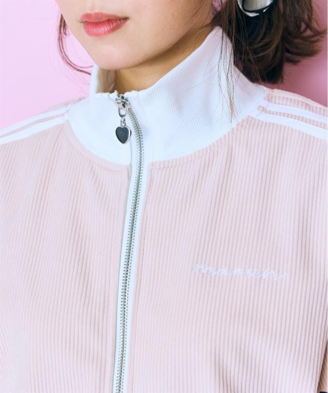 リボン×ハートデザインが可愛い、コーデュロイトラックジャケット ■デザイン サイドダブルラインは袖口位置でリボンに。胸元刺繍入。ダブルジップ×ハートチャームデザイン。リブ・サイドラインは配色になっています。クロップド丈でハイウエストボトムやワンピースに合わせやすい丈感になっています。 ■素材 やわらかい肌当たりのコーデュロイ生地を使用しました。ネック・裾・袖口は相性の良いリブ生地を仕様しています。 ■おすすめのスタイリング 甘めのチュールスカートなどと合わせてスポーツMIXテイストのコーデがおすすめ ハイウエストのデニムやジャンスカと合わせてもちょうどいい丈感です。