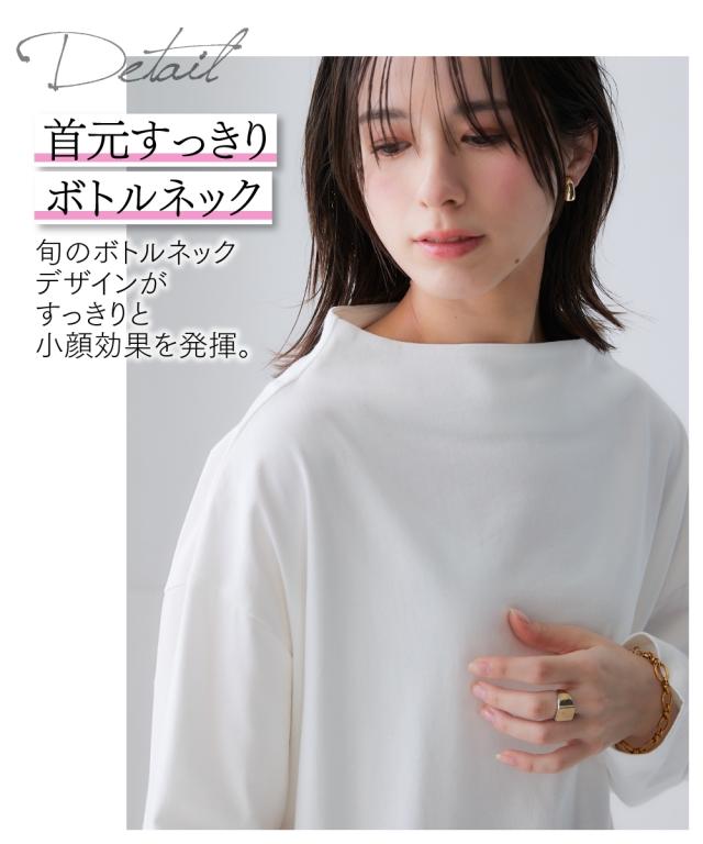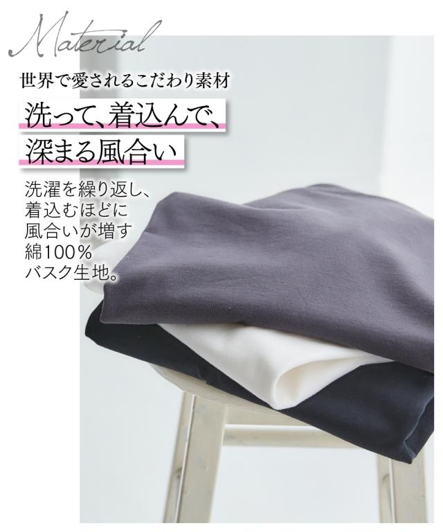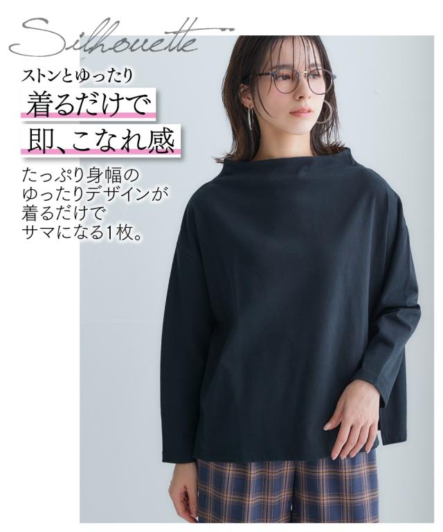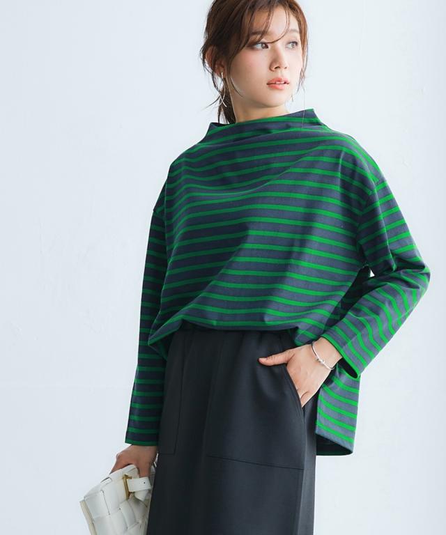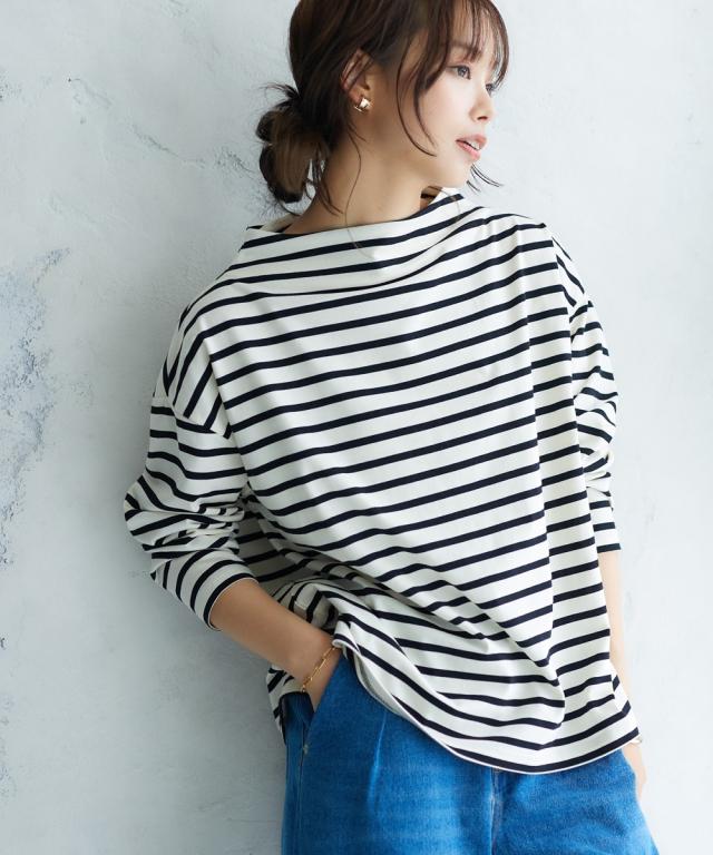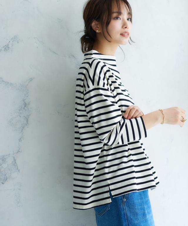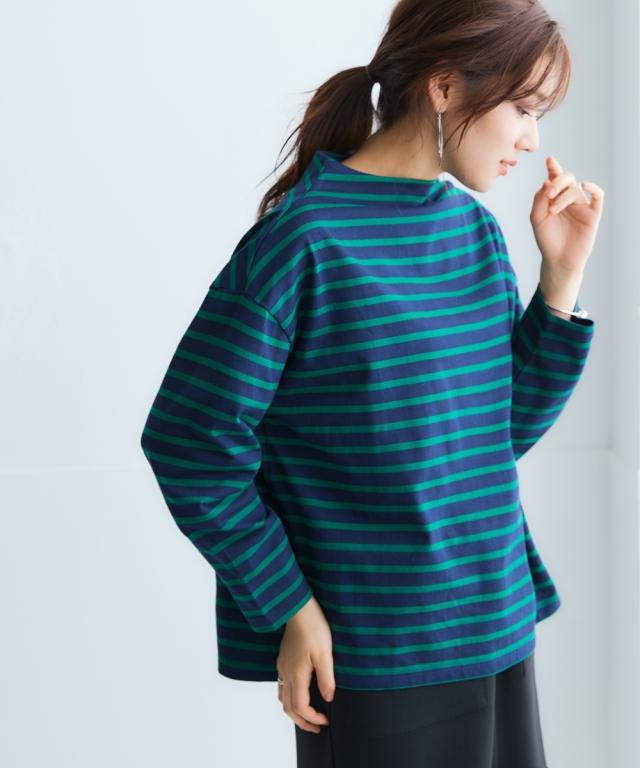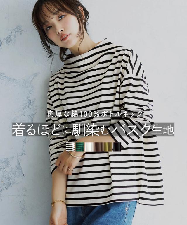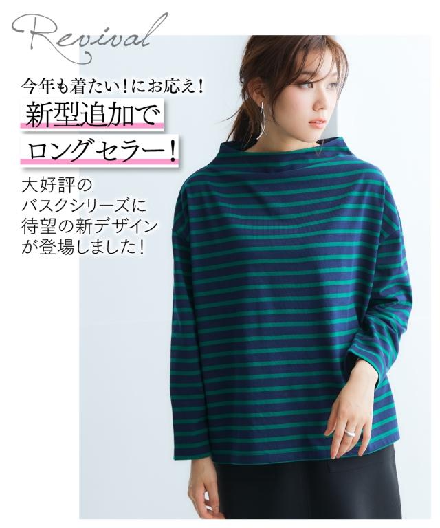 世界中で愛されてきた、歴史あるバスク生地。その魅力は肩ひじ張らずに『自然体で楽しめる』こと。 そんなバスク生地をもっと身近に楽しんでほしい。 そんな想いを込めて、素材に、色に、シルエットにこだわりました。 洗うほどに馴染み、味わいを増していく、ずっと愛用したくったり感も楽しめる1枚です。 あえてゆったりとしたお作りになっています、ぜひ着心地をお楽しみください。 綿100%で素肌にやさしくこれからの季節にぴったりです。 ■デザイン ルーズシルエットに立ち上がったボトルネックが印象的なバスクシャツです。 一見シンプルですが、ネックや袖、全体のシルエットにこだわり、女性らしい華やかさと品の良さを両立させました。 女性らしさの出るドロップショルダーに、ゆったりワイドな身幅のルーズシルエットがトレンド感のある着こなしに。 程よい厚みとハリ感で、体のラインを拾わずシルエットを美しく魅せてくれます。 やや肉厚のコットン生地はしっかりと目の詰まった長く愛用できる素材感なので、デイリーユースにぴったりです。 サイドスリット入りなのでパンツにもスカートにも合わせやすい ■素材 シルエットをきれいに魅せる、程よいハリ感が魅力のバ