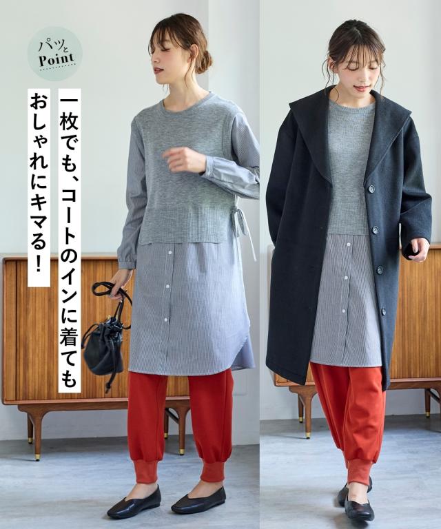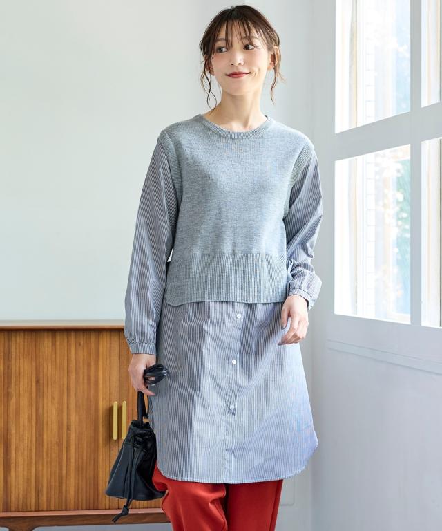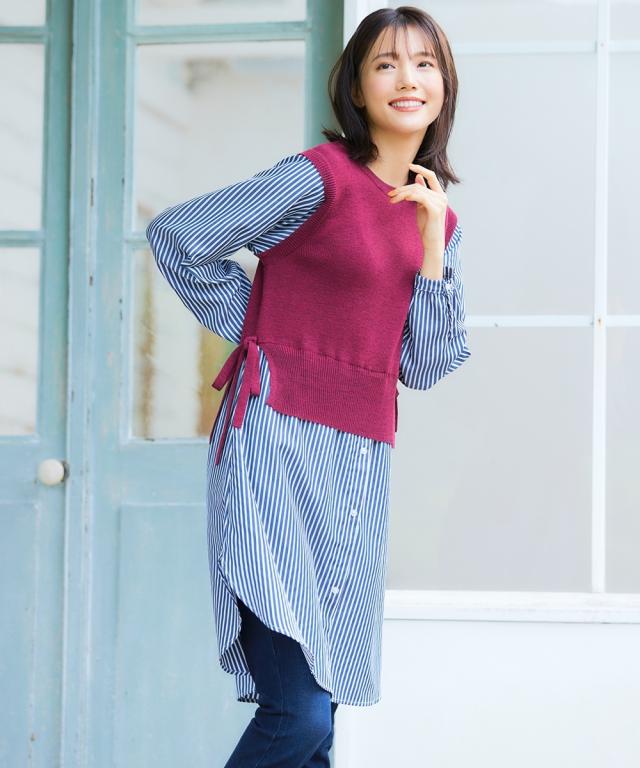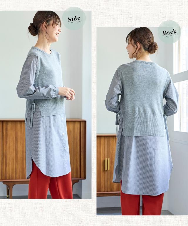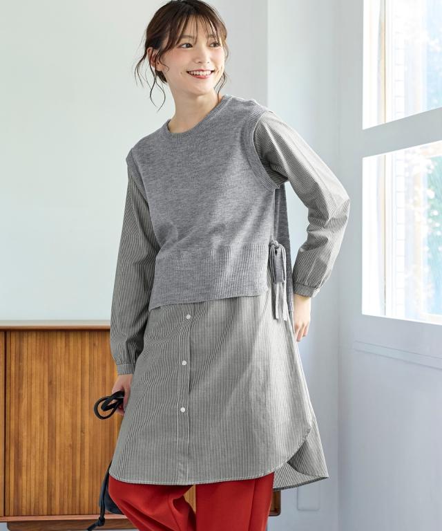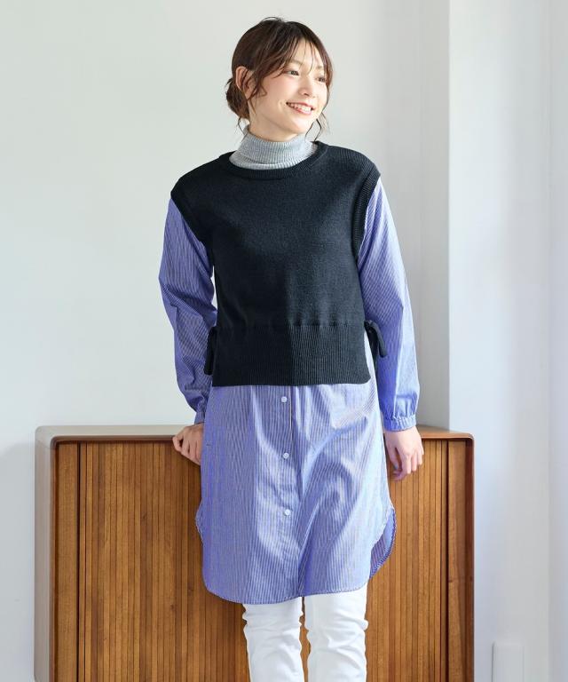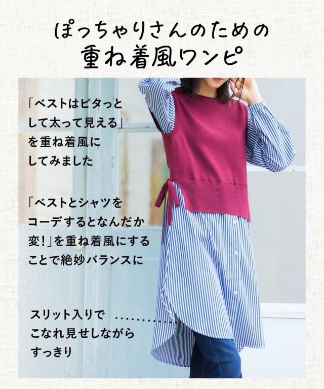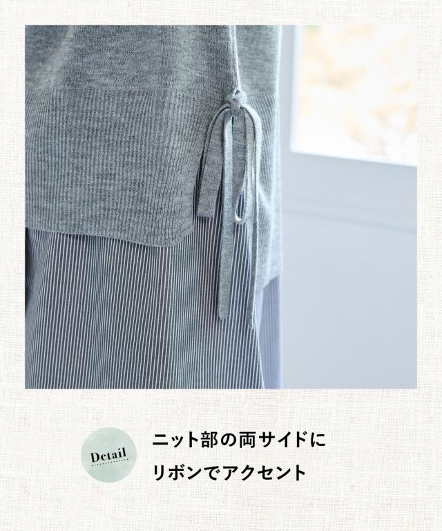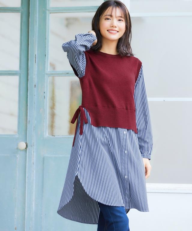 シャツワンピースとニットベストとの重ね着しているように1枚で見せられる時短アイテム。1枚着るだけでスタイリングがきまるので着ぶくれせずスッキリ見せてくれます ■デザイン シャツワンピースを重ね着したようなデザインで1枚で重ね着コーデがきまる時短アイテム。気になる下半身がすっぽり隠れる丈で安心です。脇のスリットとリボンがポイント。ストライプ柄とスリットが縦感を強調してスッキリ見せてくれます。色ごとにストライプの柄や色が違うので違うコーディネートが楽しめます。 ■素材 ほどよい厚みのニットで着ぶくれせず長く使っていただけます。布帛部は綿100%なので肌触りよく快適に着ていただけます。 ■コーディネート いつものパンツと合わせるだけでコーディネートが簡単にきまります。少し太めのパンツやレギンス・タイツと合わせてもかわいいのでお勧め。寒い時は中にタートルを合わせてもかわいいです。春まで着まわせる優秀な1枚。