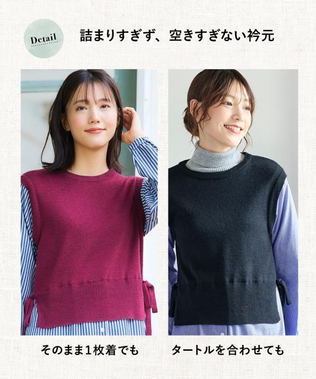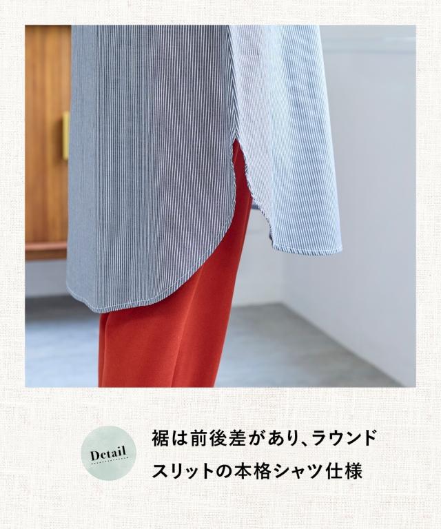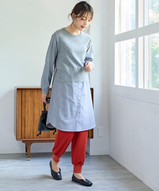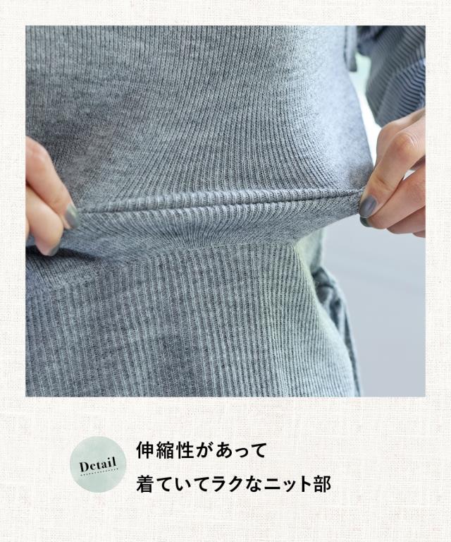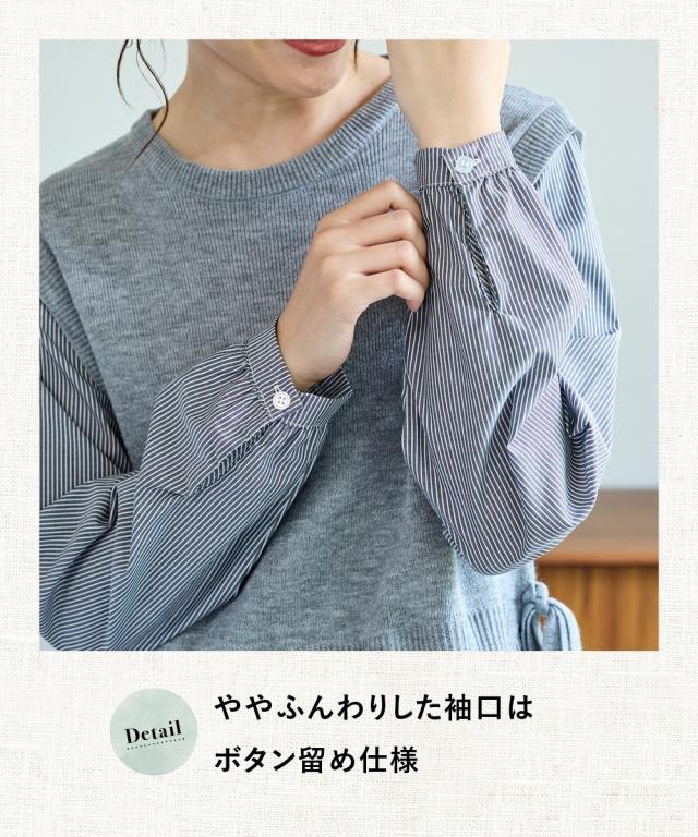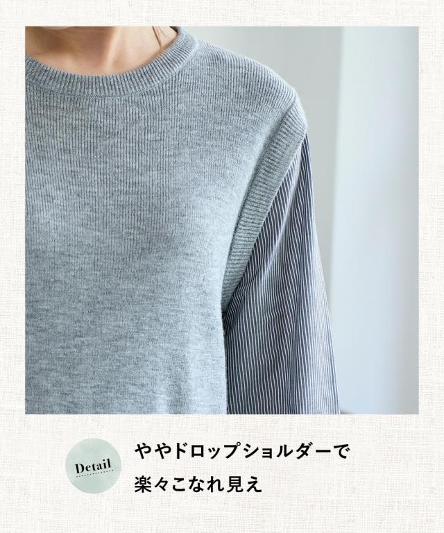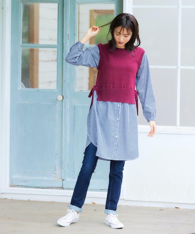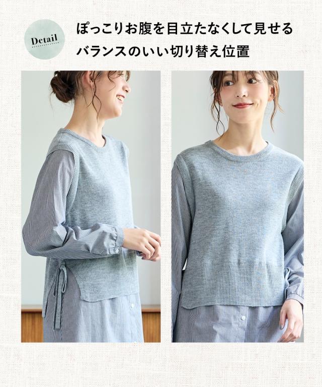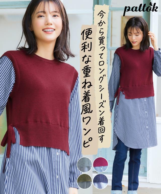 シャツワンピースとニットベストとの重ね着しているように1枚で見せられる時短アイテム。1枚着るだけでスタイリングがきまるので着ぶくれせずスッキリ見せてくれます ■デザイン シャツワンピースを重ね着したようなデザインで1枚で重ね着コーデがきまる時短アイテム。気になる下半身がすっぽり隠れる丈で安心です。脇のスリットとリボンがポイント。ストライプ柄とスリットが縦感を強調してスッキリ見せてくれます。色ごとにストライプの柄や色が違うので違うコーディネートが楽しめます。 ■素材 ほどよい厚みのニットで着ぶくれせず長く使っていただけます。布帛部は綿100%なので肌触りよく快適に着ていただけます。 ■コーディネート いつものパンツと合わせるだけでコーディネートが簡単にきまります。少し太めのパンツやレギンス・タイツと合わせてもかわいいのでお勧め。寒い時は中にタートルを合わせてもかわいいです。春まで着まわせる優秀な1枚。
