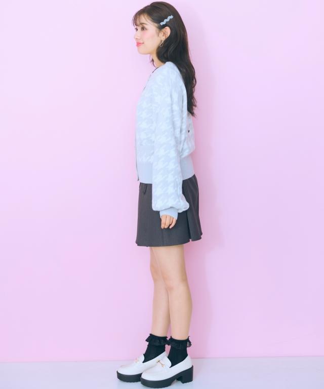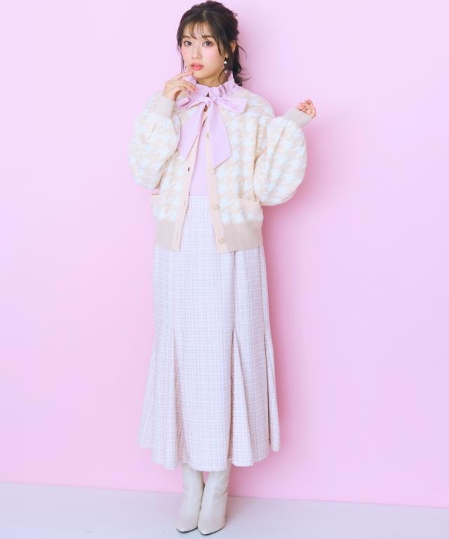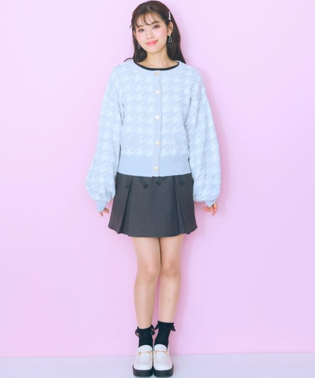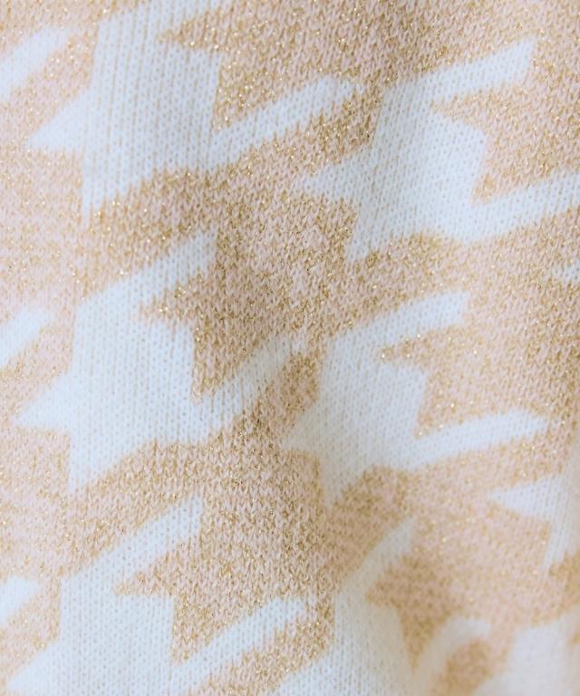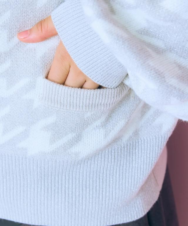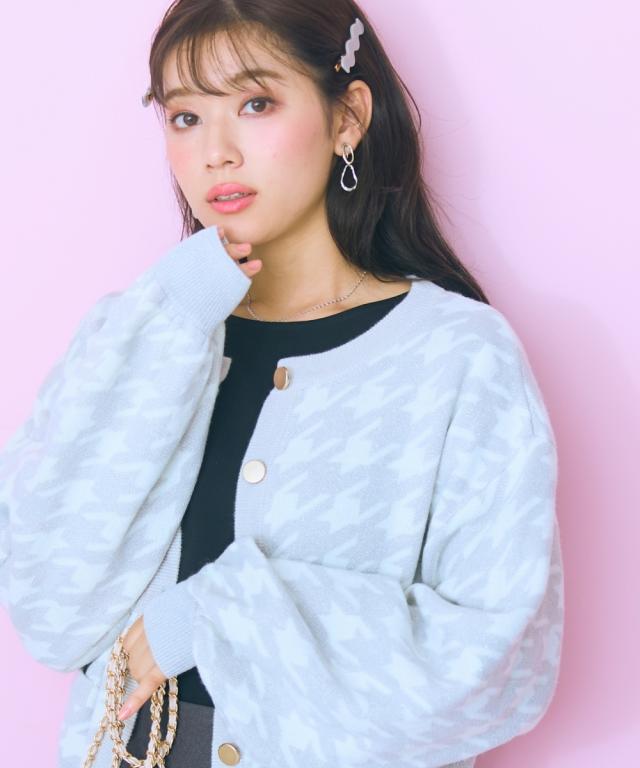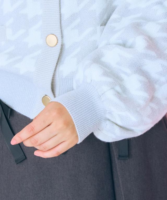 千鳥格子柄×ラメ×メタル風ボタンの組み合わせが可愛い、おすすめ柄カーディガン。 ■デザイン フェミニン系と相性のいい丸首カーディガン。ボリュームスリーブ&肩幅大きめのデザインでさらっと着用しやすいデザインになっています。ボタンはマットなゴールド色を採用しました。ポケット付。 ■素材 肌触りのいい糸を使用しました。柄の配色部分にラメ糸を引き揃えています。 ■おすすめのスタイリング リボンタイブラウスとのコーデがおすすめ。シンプルなコーデに一枚差し込むだけで華やかになります。