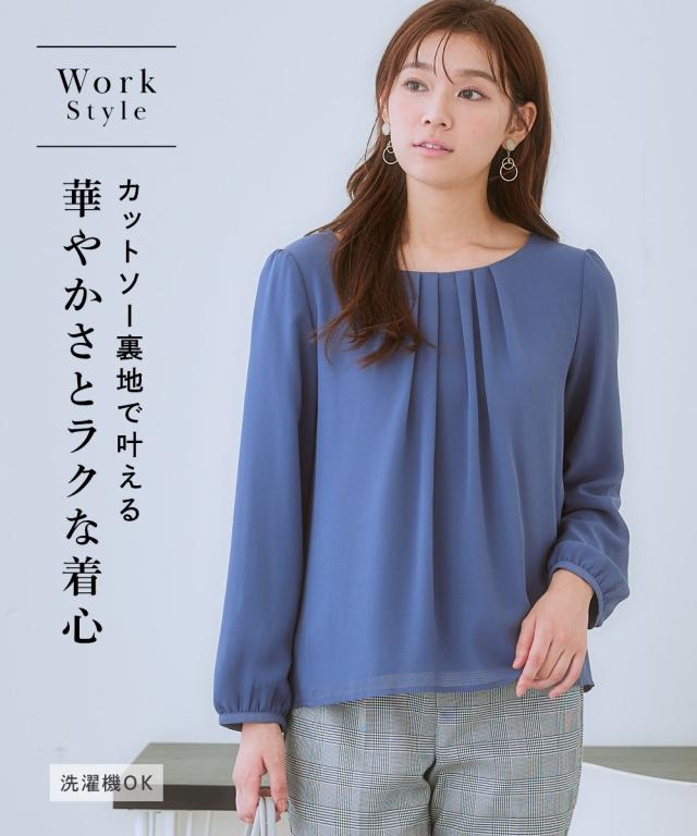 【シンプルなのにほんのり華やぐフロントタックブラウス】カットソー素材裏地付きだから、ほんのりシアーなシフォン素材をたっぷり楽しんで。 ■ポイント ・働く服改革「オフィス女子モニター」さんのご要望でつくったブラウス。 ・人気のシフォン前タックブラウスがゴムなし裾になって登場。 ・大きいサイズも新たに展開しました。 ■デザイン ・着映えながら、ふんわり体型カバーする胸もとのフロントタックデザイン。 ・ゴムのないフラットな裾。 ・透けにくいカットソー裏地付き。 ■素材 ・表地は上品な質感でオフィス使いにぴったりのシフォン素材。 ・裏地は着心地のいいカットソー素材。 ・UVカット機能付き。 ・洗濯機洗いOKなお手入れ簡単素材。 ■おすすめのスタイリング ・胸もとのタックを生かしたジャケットインがおすすめ。 ・パンツでもスカートでも、ボトムを選ばずすっきり決まります。 〜7days Life Styling〜 仕事の日、休日、イベントの日まで、 働く女性の毎日を商品やコンテンツを通して、 自分らしく快適でいられる“働く服改革”をサポートします。