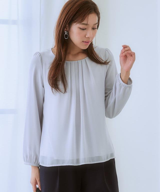 【カットソー裏地付】シフォン前タック9分袖ブラウス(裾ふらし)