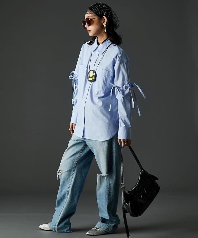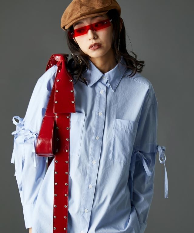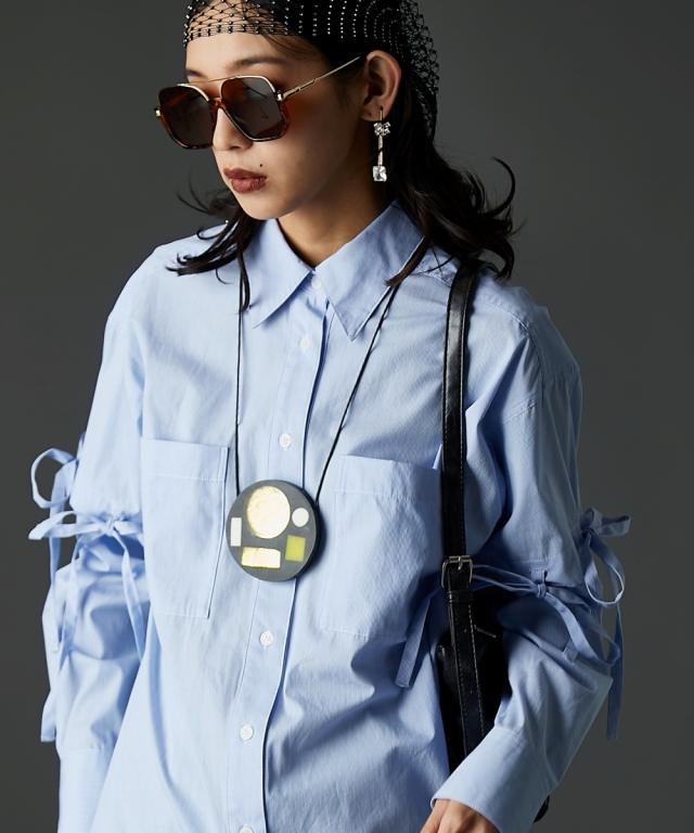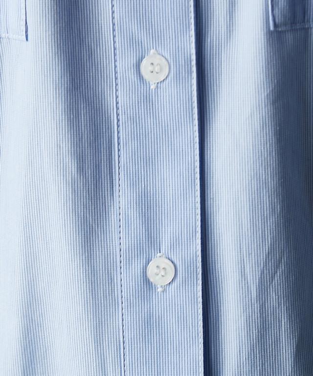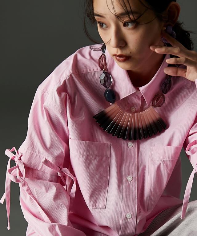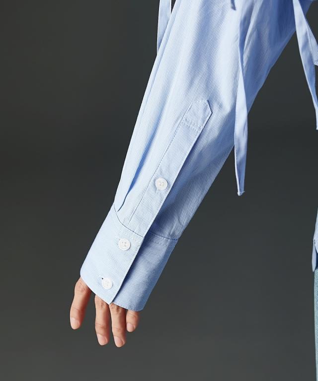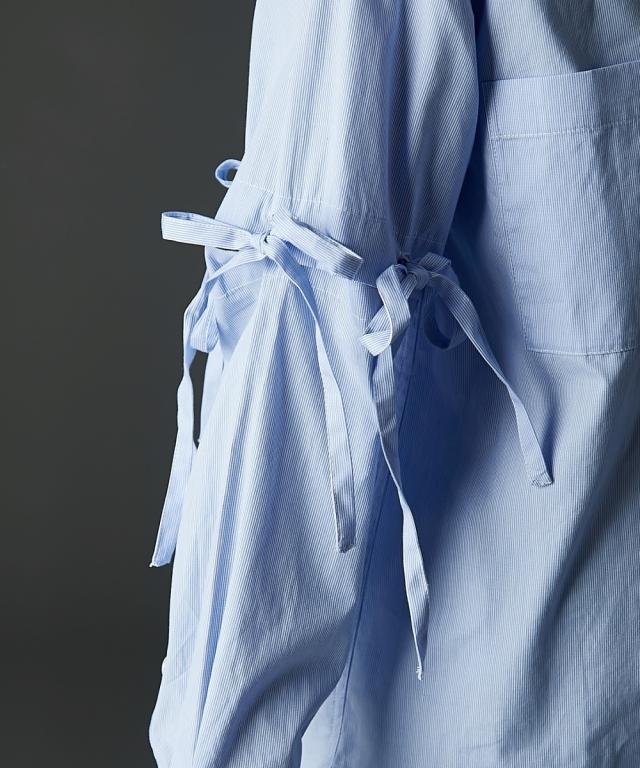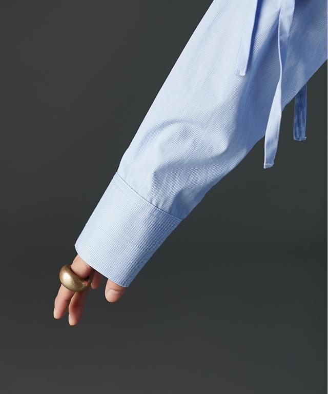 アレンジでイメージが変わるストライプシャツ。 ■デザイン 通気性もよく軽い着心地でシーズンを問わず長い時期着ていただけます。 肌離れのよい爽やかなタッチで心地のよい着やすさとなっております。 袖はリボンを外す事で長袖と半袖の2パターンを楽しんでいただけるデザイン。 袖下2箇所をボタンで袖を止める事でスリットスリーブにもできます。 ゆったりとしたオーバーシルエットで体系カバーもでき、着心地の抜群。 ■素材 綿100%のストライプ生地を使用。 ■おすすめのスタイリング いろんな袖にできるアレンジが効くシャツ。 半袖にリボンを残した着方がオススメです。 ボトムはスカートでもパンツでも合わせやすく、袖のアレンジとボトムとの組み合わせでイメージを変えられるシャツです。