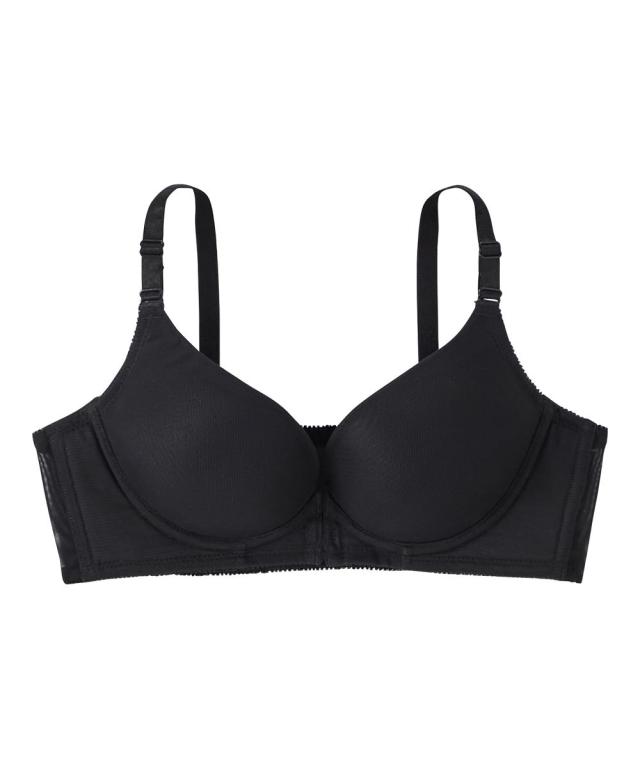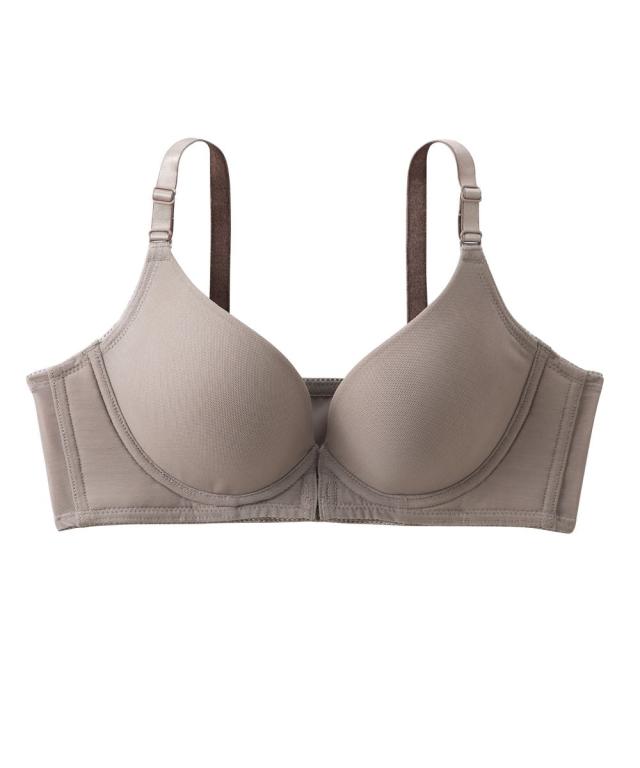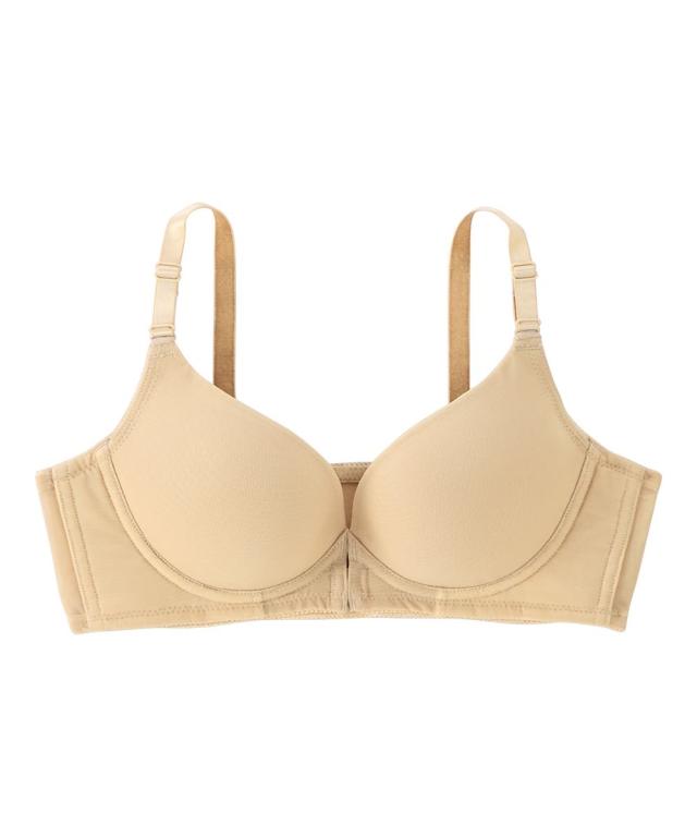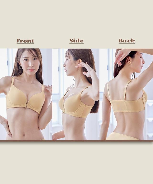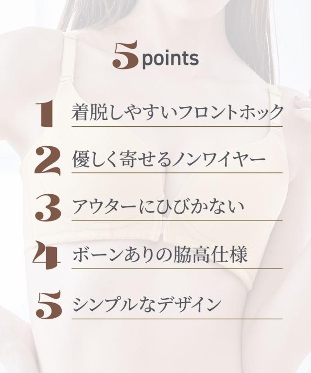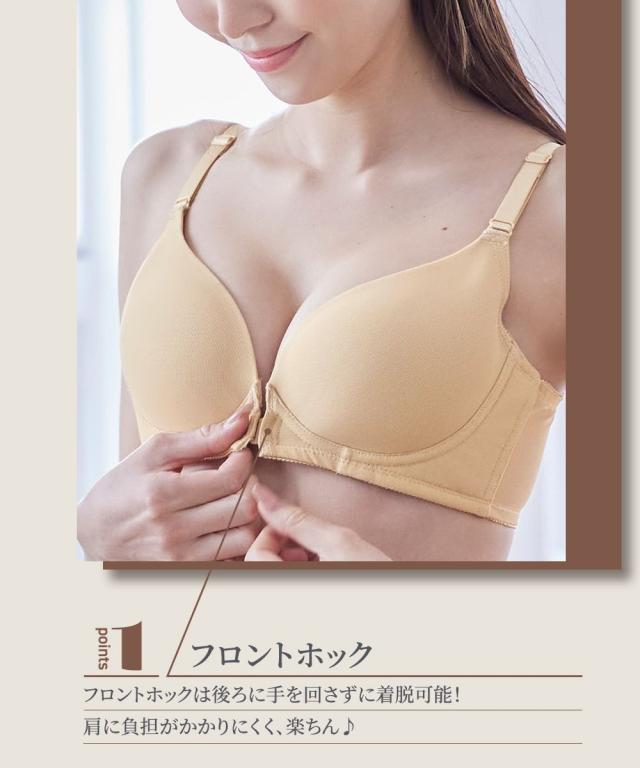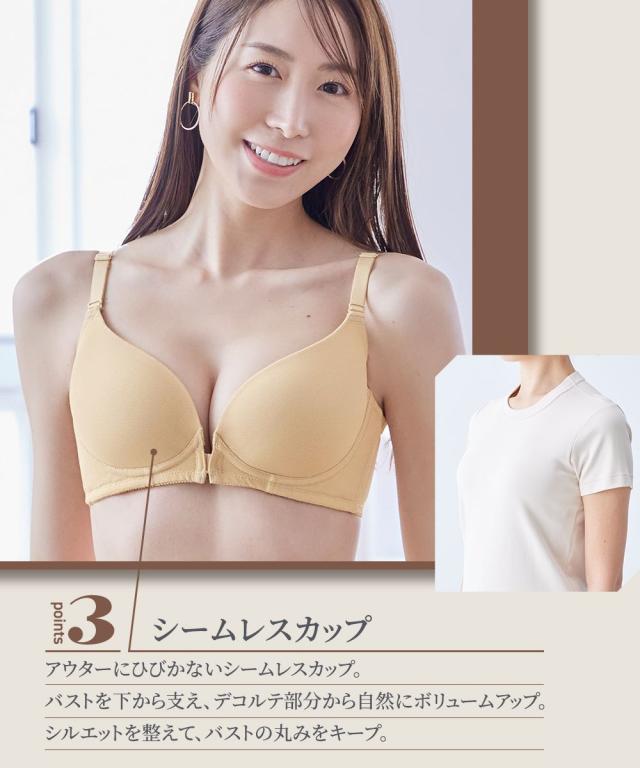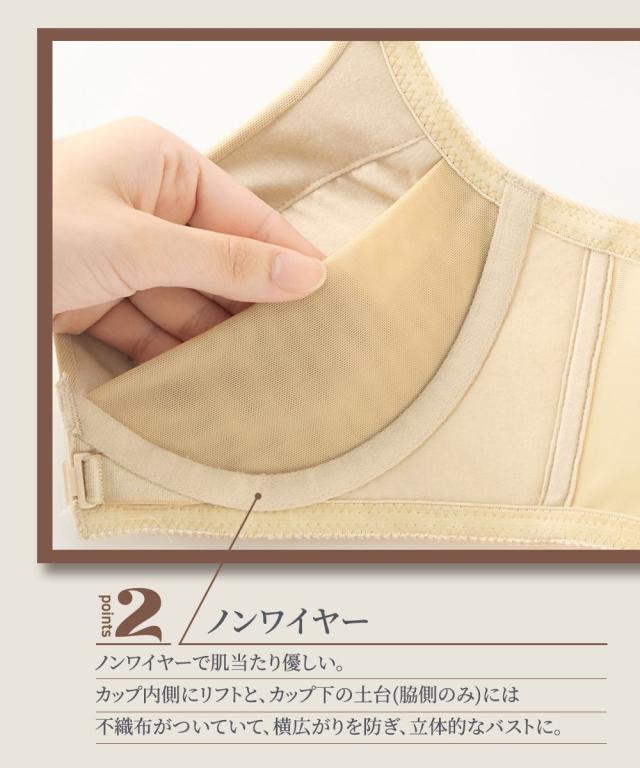 「内緒でメイク!」人気シリーズにフロントホックが新登場。楽に着脱ができるフロントホックがあったらいいな!のお声により生まれました。ノンワイヤーで肌当たり優しいのに、バストが横流れしないような工夫がたっぷりで、シルエットをキレイに。●ポイント1「着脱しやすいフロントホック」後ろに腕をまわさなくていいから、肩や腕が楽ちん 着脱時とってもスムーズです!●ポイント2「ノンワイヤーなのに谷間キレイ」1)バストをしっかりキープカップ裏リフト。2)土台脇側は、肌側に不織布入りでノンワイヤーでもしっかり支えます。3)サイドボーン入りで脇すっきり。●ポイント3「アウターにひびきにくい」モールドカップはシームレス仕様のため、Tシャツやニットなどのぴったりしたアウターにも響きにくい。バックベルトもパワーネットのみのシンプルデザイン。コーディネートして着用いただける、綿95%のショーツも別売りでご用意しています。ぜひ合わせてご検討ください