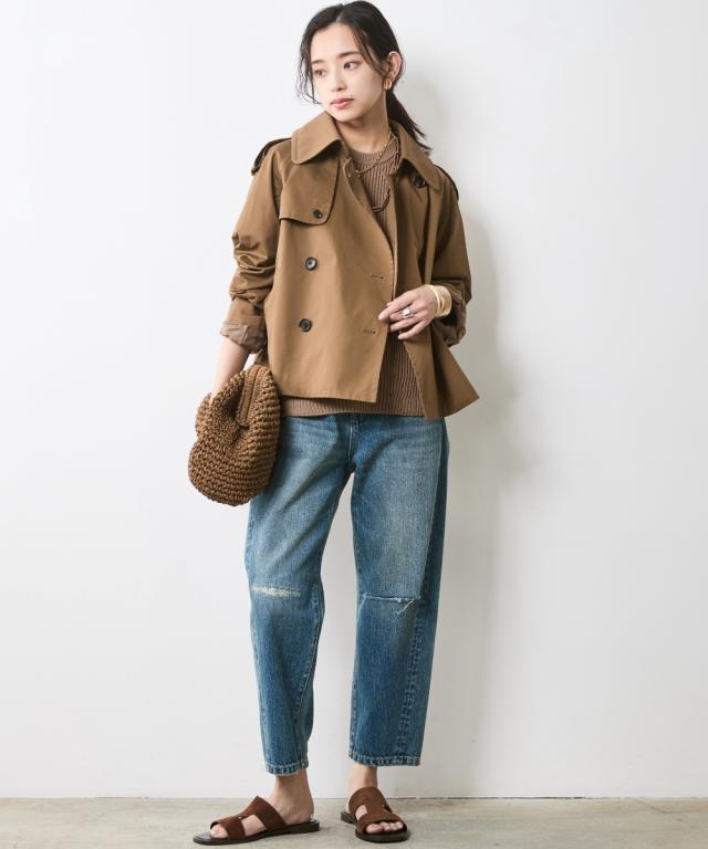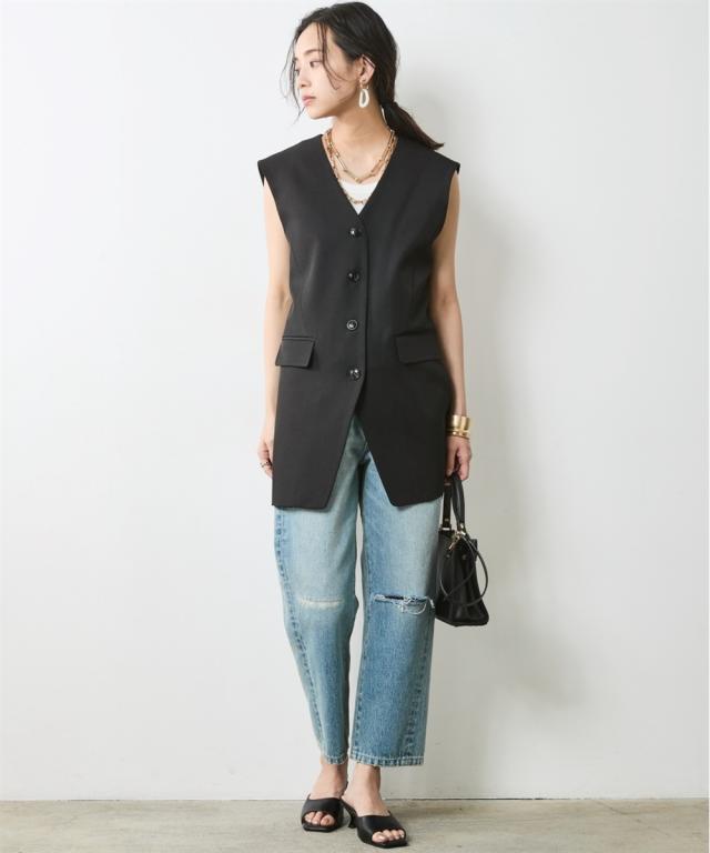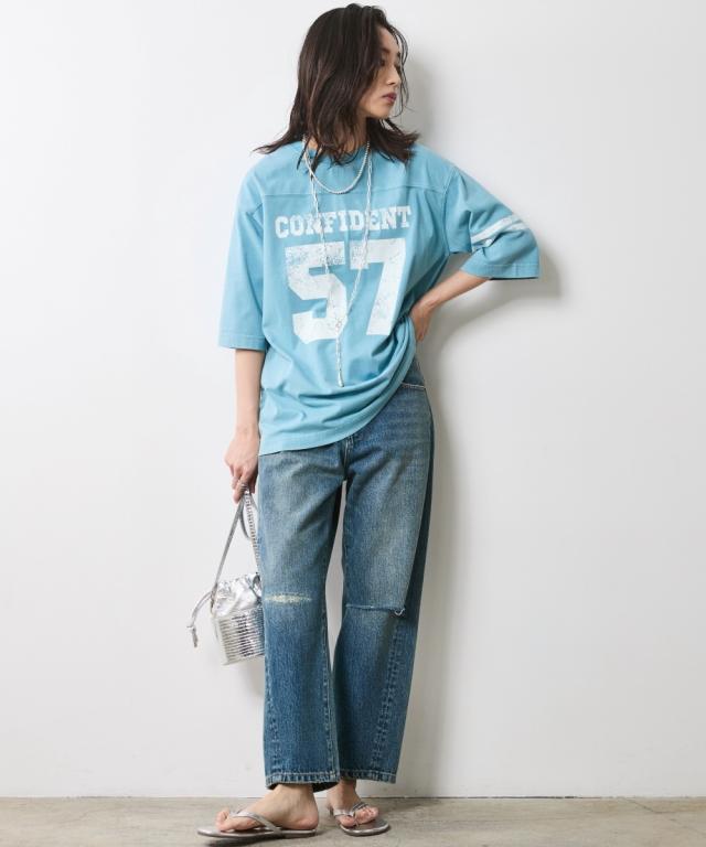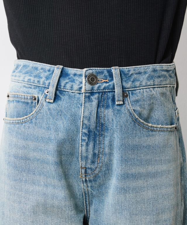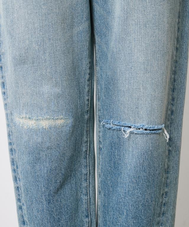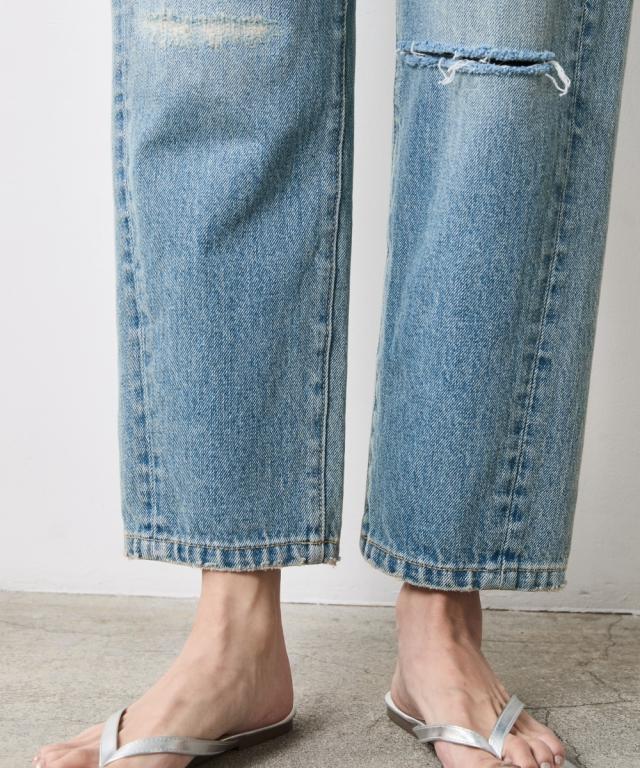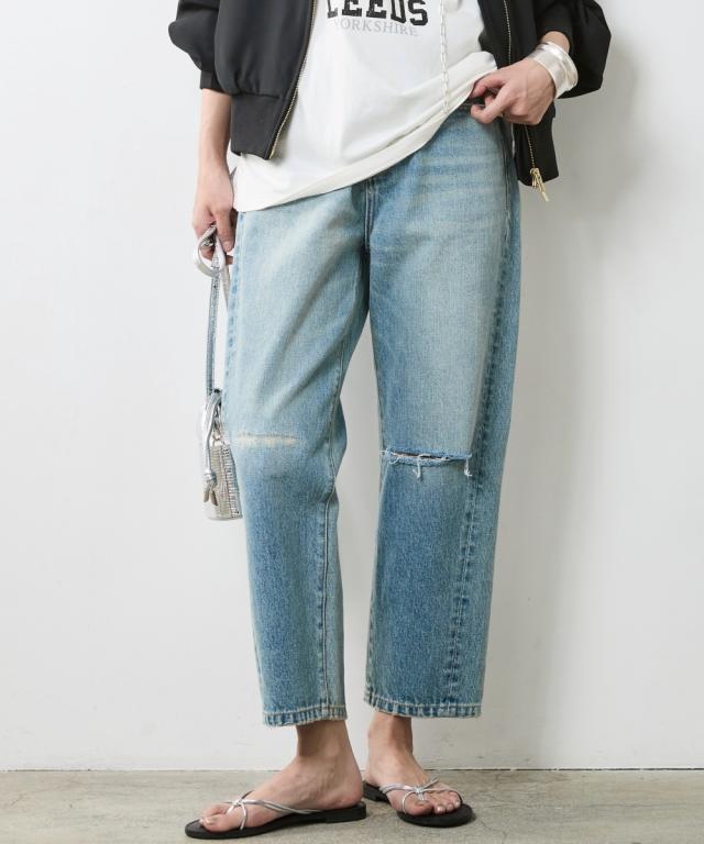 夏スタイルにピッタリの9分丈デニムパンツ。 ■デザイン ダメージ加工でアクセントを効かせたデニムパンツです。 ウエストをしっかり包みこむ股上深めの設計で、腰まわりまで自然とカバーする一本。 脇線を少し前に振ったパターンで女性らしい丸みを感じるシルエット。 左膝にクラッシュ加工を施し右膝にはクラッシュ加工を施してからヴィンテージデニムをリペアしたようなガチャステッチを施した、こだわりのデザイン。 足元がすっきり見える少し短めのレングスで足首を少し見せる夏らしいデニムパンツ。 サンダルとも相性が良く、カジュアルの中に女性らしさをのぞかせるスタイルがオススメ。 ■素材 ヴィンテージデニムのような自然なムラ糸が特徴的な綿100%のデニム生地を使用 ■おすすめのスタイリング トップスはどんなデザインでも合わせやすくヘビロテ間違いなしのパンツ。 足元はスニーカーはもちろんですが、ソックスにサンダルなど、ヴィンテージ加工感とは対照的に足首が見える女性らしいスタイリングがおすすめです!