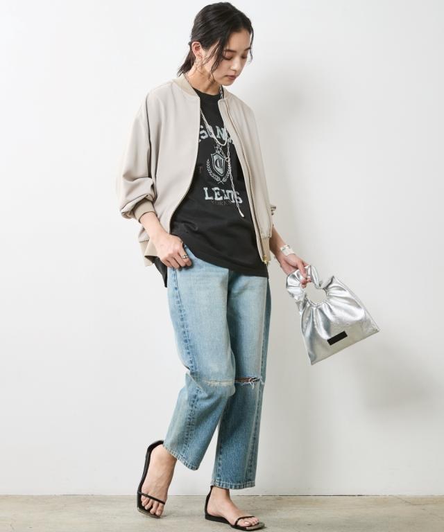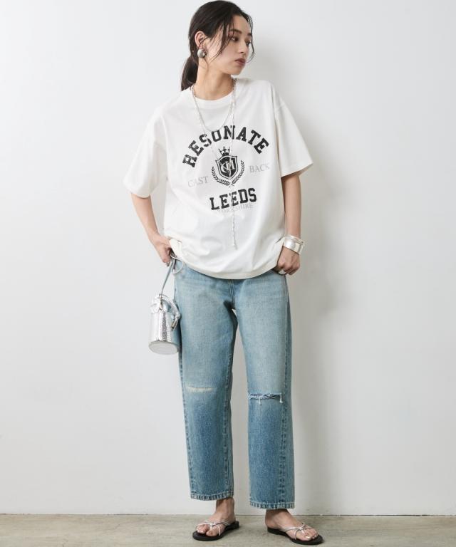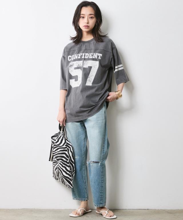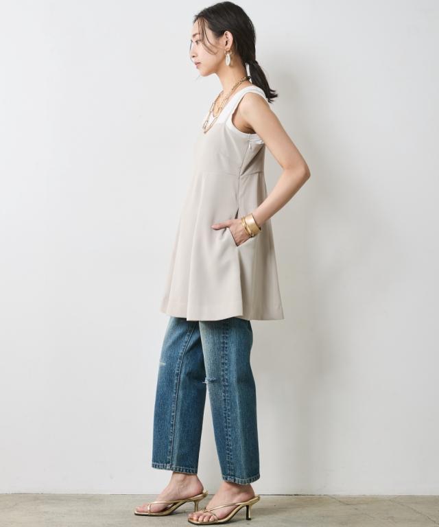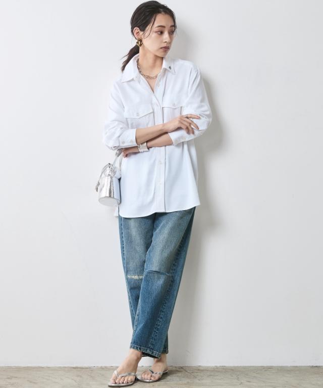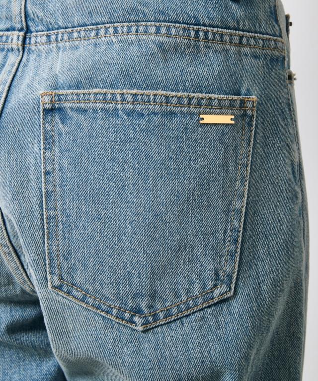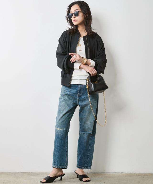 夏スタイルにピッタリの9分丈デニムパンツ。 ■デザイン ダメージ加工でアクセントを効かせたデニムパンツです。 ウエストをしっかり包みこむ股上深めの設計で、腰まわりまで自然とカバーする一本。 脇線を少し前に振ったパターンで女性らしい丸みを感じるシルエット。 左膝にクラッシュ加工を施し右膝にはクラッシュ加工を施してからヴィンテージデニムをリペアしたようなガチャステッチを施した、こだわりのデザイン。 足元がすっきり見える少し短めのレングスで足首を少し見せる夏らしいデニムパンツ。 サンダルとも相性が良く、カジュアルの中に女性らしさをのぞかせるスタイルがオススメ。 ■素材 ヴィンテージデニムのような自然なムラ糸が特徴的な綿100%のデニム生地を使用 ■おすすめのスタイリング トップスはどんなデザインでも合わせやすくヘビロテ間違いなしのパンツ。 足元はスニーカーはもちろんですが、ソックスにサンダルなど、ヴィンテージ加工感とは対照的に足首が見える女性らしいスタイリングがおすすめです!