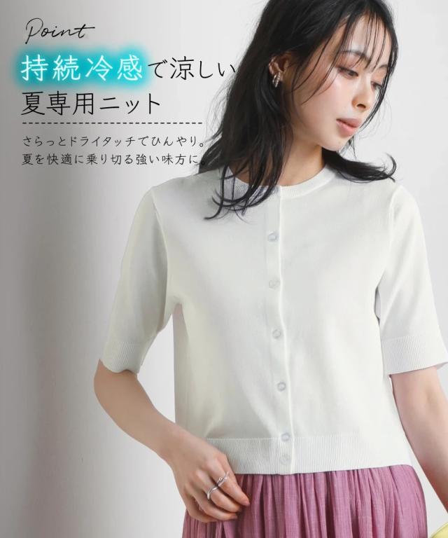 カーディガン ニット レディース クルーネック 5分袖 持続冷感 接触冷感 毛玉になりにくい UVカット 洗濯機で洗える 遮熱 ニッセン nissen