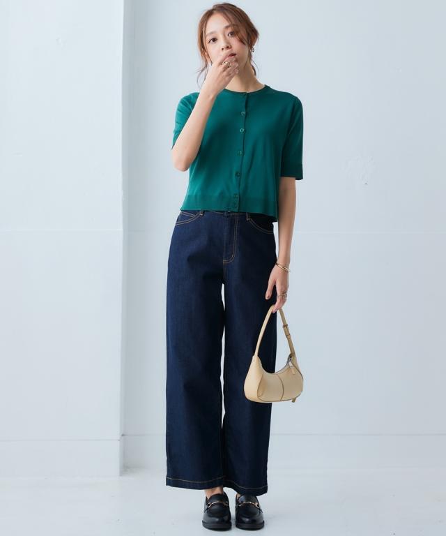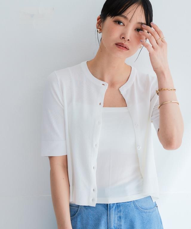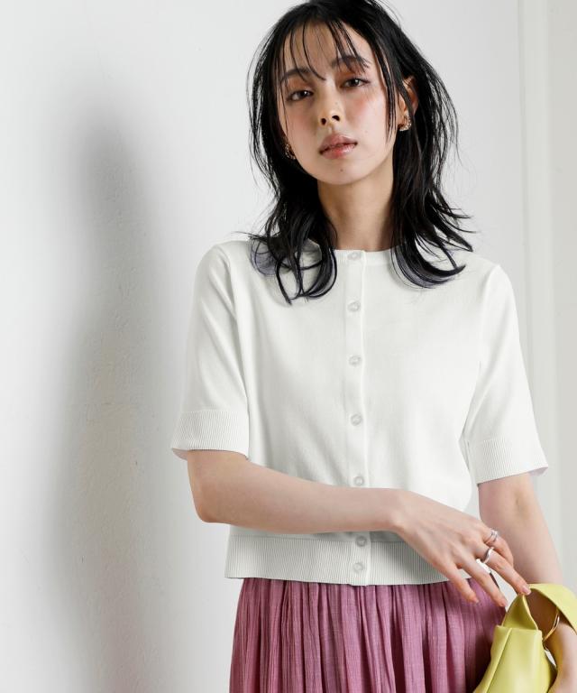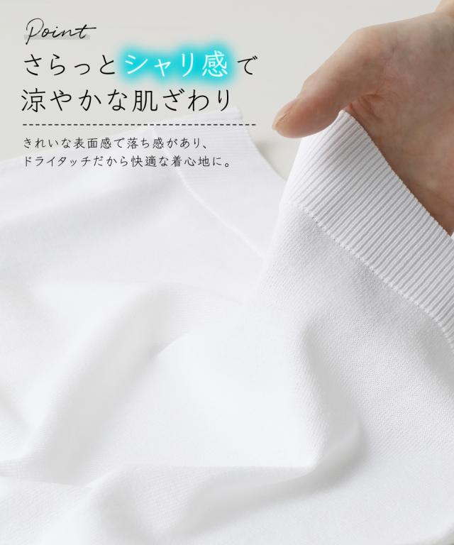 暑い季節に嬉しい!ひんやりが続く「持続冷感」の新素材ニットシリーズです。 ■デザイン 無駄を削ぎ落とした、シンプルで美しいクルーネックデザイン。 どんなスタイルにも合わせやすい、着回し力抜群のベーシックアイテムです。 ロングシーズン使えて、二の腕をさりげなく隠せる5分袖。 程よいフィット感と、ワンピの羽織やハイウエストボトムスに使えるコンパクト丈。 ノースリーブやキャミソールなどのコーディネートに重宝する1着です。 冷房などの冷え対策にもおすすめ。 オフィスにもカジュアルにも、シーンを選ばず活躍します。 ■素材 さらっとシャリ感のある涼やかな肌触りで快適な着心地。 毎日着るものだからこそ、素材の品質と機能性にこだわりました。 ・ひんやりが続く持続冷感加工 ・毛玉になりにくく、きれい長持ち ・服の温度が上がりにくい遮熱素材 ・UVカット素材 ・洗濯機で洗えるのでお手入れもラクラク ■おすすめのスタイリング Tシャツスタイルにさらりと羽織ってこなれ感をプラス。 オフィスでは、ブラウスやカットソーに重ねて、きちんと感を演出。 ワンピースやスカートと合わせて、フェミニンな着こなしも楽しめます。 同系色のボトムスと合わせて、セットアップ風に