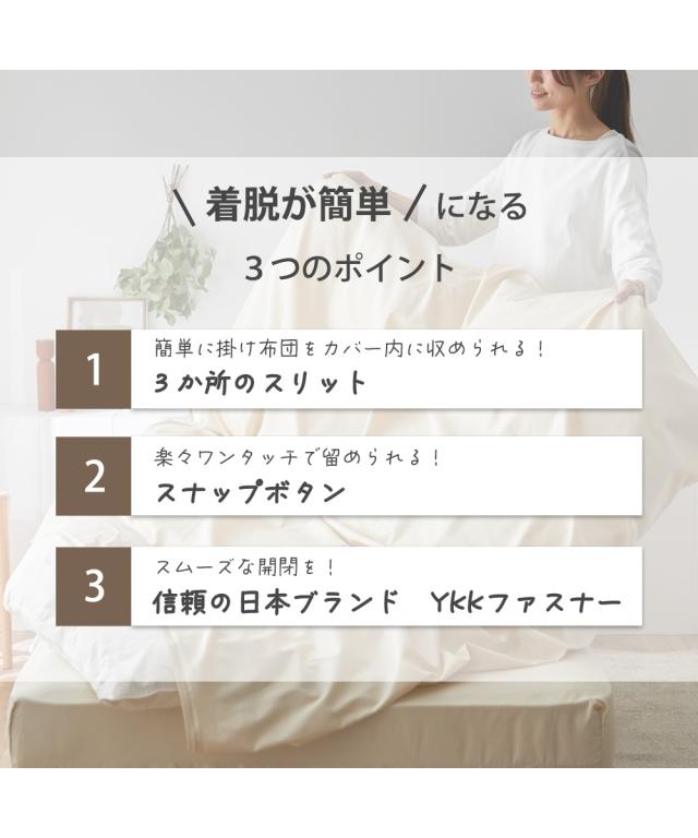 やわらかな肌触りで快適な眠りをお届けする、綿100%の掛け布団カバー。独自の3か所スリットと楽々スナップボタンで着脱簡単!忙しい毎日でも気軽にお手入れできます。ツイル織りで仕上げた生地は、上品な光沢と滑らかな肌触りが特徴。オールシーズン快適にお使いいただけます。<着脱簡単の秘密>・3か所スリットスリットに手を入れ、掛け布団を引っ張ることで、簡単にカバー内に布団を入れることが可能です。・スナップボタンカバーの両端にあるズレ防止ヒモ。結ぶ時も外す時も意外と手間がかかります。このカバーはワンタッチで留められるスナップボタンを使用しているので簡単です!・YKKファスナー品質を技術力の高いYKKファスナーを使用しております。<おすすめ>・サラッとした綿100%吸水性が高く、寝ている間の汗などを吸収して放出してくれるので、サラッと爽やかな肌あたりが特徴です。・柔らかく肌あたりのよい40番手の糸を使用しており、比較的細くなめらかで、寝具に適しているので、快適な眠りを提供できます。・デイリー使いにちょうどいい打ち込み本数は196本で、打ち込み本数の数値が高いほどきめ細かく滑らかな生地になるので、デイリー使いにちょうどいい扱いやすいものになります。・