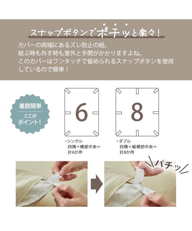 ●品質:綿100% ●布団留め用スナップボタン付(シングル・セミダブル:6ヶ所、ダブル:8ヶ所) ●全開ファスナー使用(YKKファスナー使用) 原産国:中国製 備考:洗濯機OK ネット使用