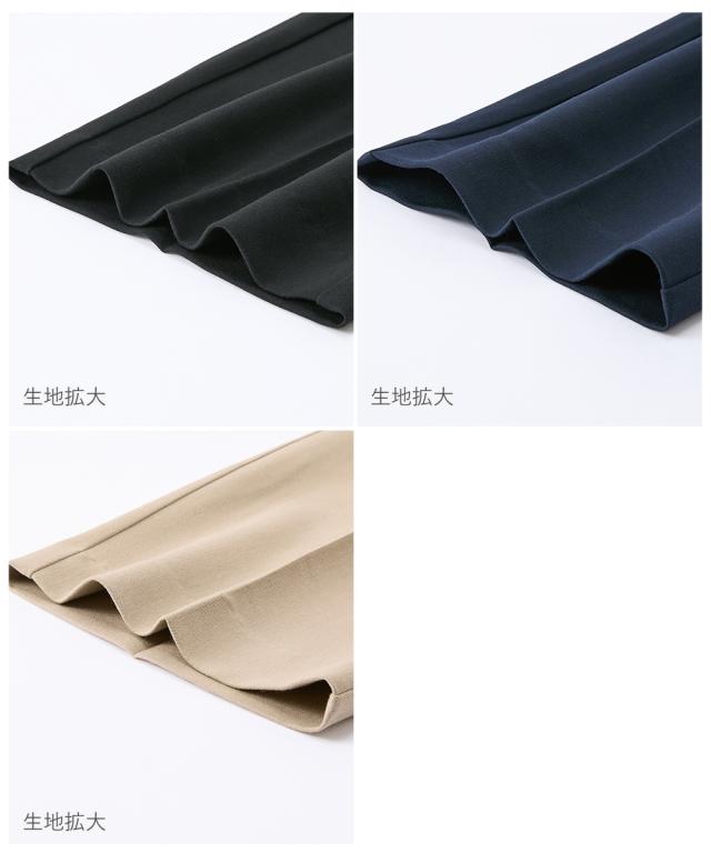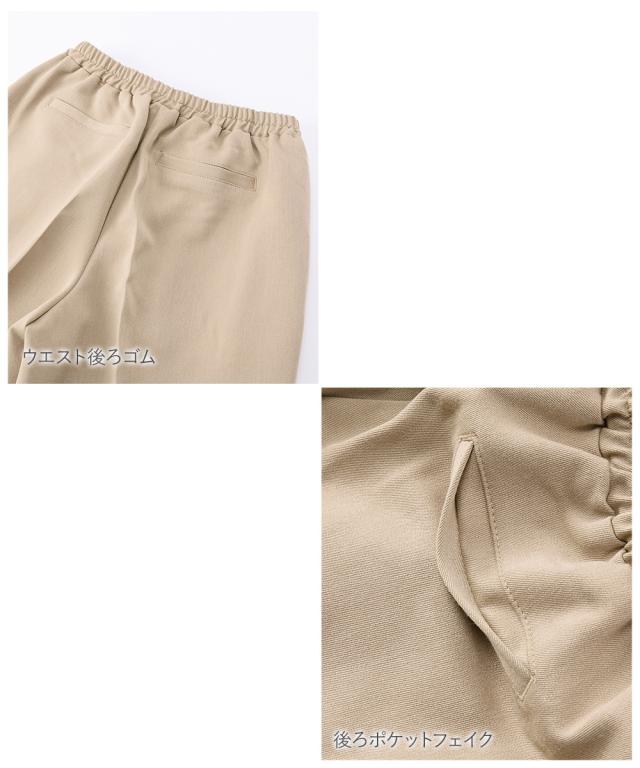 品質=ポリエステル75%・レーヨン20%・ポリウレタン5%透け感:透けにくい※淡色カラーはベージュインナー着用をおすすめします。 ※色によって透け感が異なる場合があります。伸縮性:ややあり生地の厚み:普通光沢感:なし裏地:なしポケット:両サイドポケット2つ、後ろポケットフェイク2つウエスト:後ろウエストゴム、ベルトループなし季節:春秋冬向きシルエット:ゆったり 原産国:中国製 備考:洗濯機OK(ネット使用) ※単位:cm※サイズの誤差は多少発生します。※サイズ表は仕立てサイズになります。仕立てサイズとは