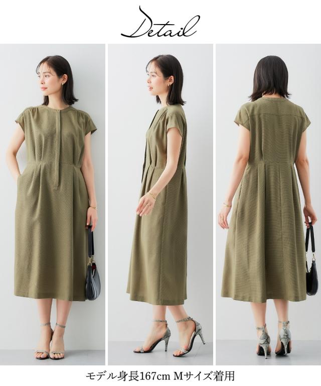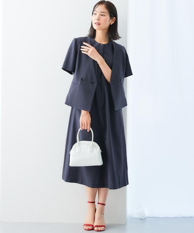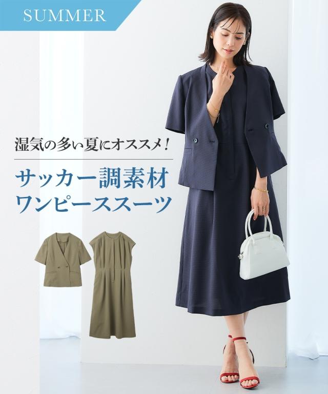 ◆過酷な日本の夏を、少しでも快適に。働く女性に寄り添う、見た目も涼しげなおしゃれ半袖スーツ ◆◆デザイン・ダブルブレストで少しゆるっとしたノーカラージャケットはワンピースにぴったりな丈感が ! ボリュームの出すぎないフレアシルエットのロング丈ワンピースでこっそり体系カバーも☆・ジャケットの袖丈はあえて少し長めの半袖で気になる二の腕をカバー&デスクワークの邪魔にもならないのが ・ワンピースのスカート部分は清涼裏地付き ポケットもついているのがうれしい!◆素材◆・薄くて軽いのにきちんと見えする、うすカルサッカー調素材 ・汗をかく時期にぴったりな吸汗速乾機能やUVカット機能など夏にうれしい機能が充実!・しわになりにくいので、ジャケットを手持ちすることが多い夏にはうれしい ストレッチ入りなので着心地もラクチンです☆・スーツなのに洗濯機で洗えるのが