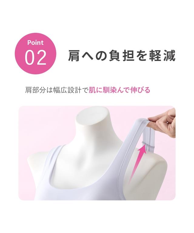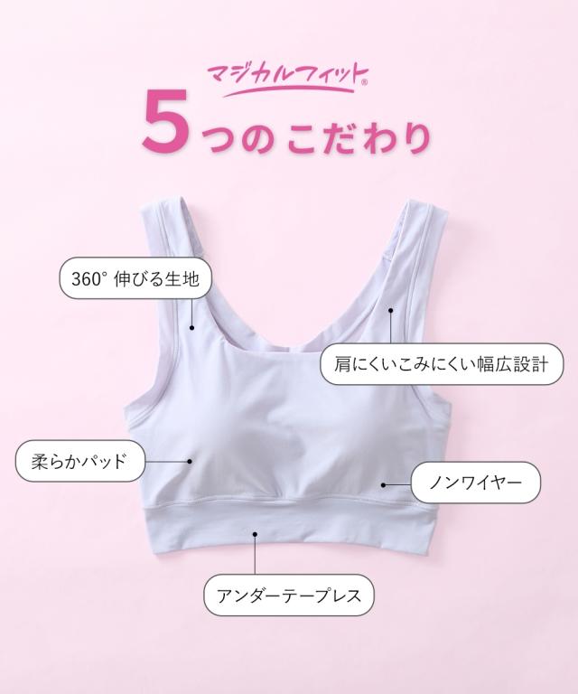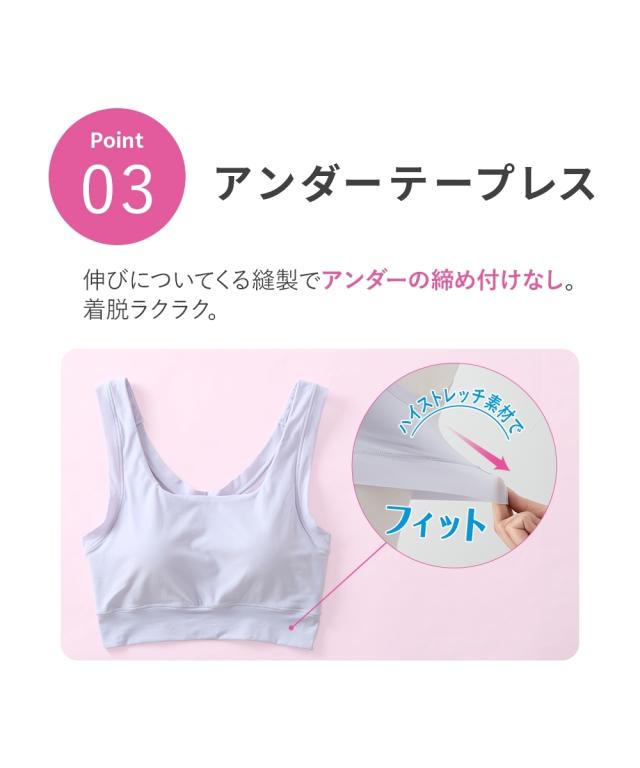 部活動やオフタイムにも最適!すっぽりかぶりタイプなので着脱もラクラク! 縦、横、斜め、360度ぐーんと全方向によく伸びる。 ストレッチ性が良い生地を採用し、ちょっとしたバストのサイズ変化にもピタッとフィット! ラクしたい日にも、普段使いにも、毎日つけたいやわらかくて肌ざわり気持ちいいジュニアハーフトップブラジャーです。