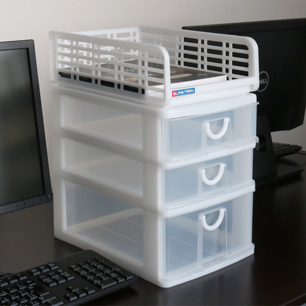 幅と奥行きが同じサイズのトレーやケースを積み重ねられます。縦のスペースを有効活用でき、机や棚がスッキリ片付きます。