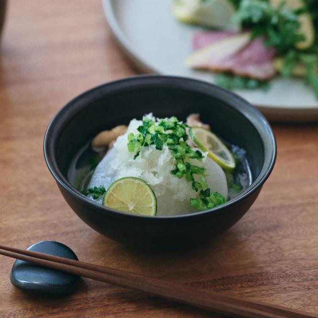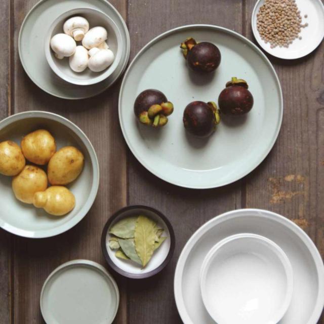 プレートという洋食器よりの形に垂直なリムを付け足すことで、汁物の多い和食に対応できるデザインになっています。和食、洋食、どんな料理にも合う使い勝手のよいうつわです。