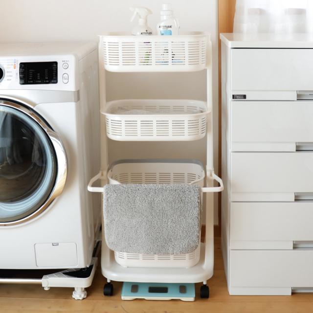 下段のバスケットには脱いだ服、上段・中段のバスケットにはタオルやパジャマなど分けて使用することで、衣類が散らかりません。狭い脱衣所でも場所をとらずにご使用頂けます。