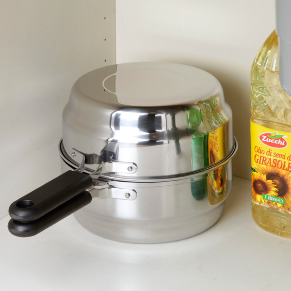 リサイクルした油の入ったオイルポットはそのまま天ぷら鍋として使用できるので、油の移し替え要らずで手軽に揚げ物ができます。また、空の方の鍋を逆さにして重ねるとコンパクトに収納でき、埃の侵入も防げます。
