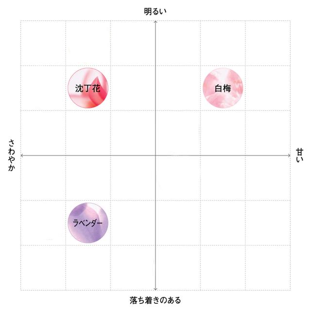 天然のラベンダーエッセンスを使用したラベンダー。白梅の透明感をホワイトフローラルの上品な香りで再現した白梅。沈丁花の可憐な姿をシトラスフローラルの爽やかな香りで再現した沈丁花の印象の異なる香りの詰め合わせです。