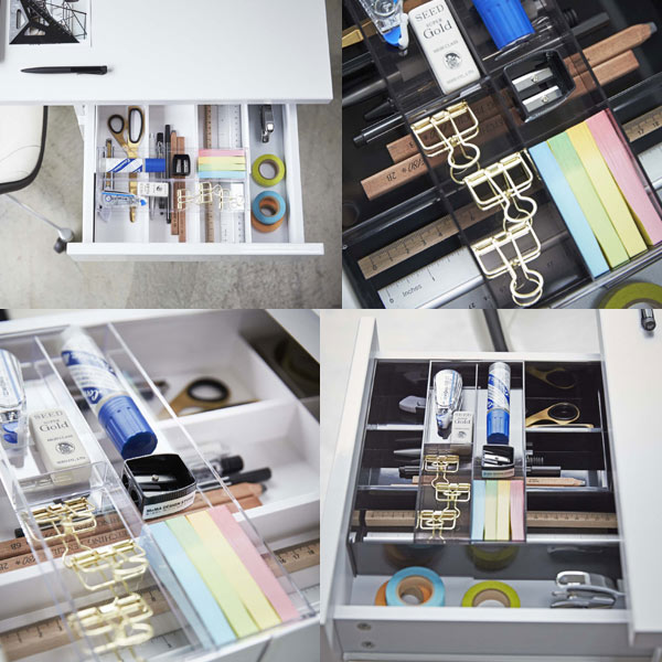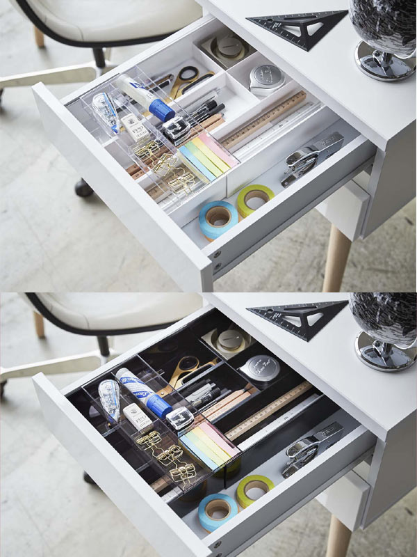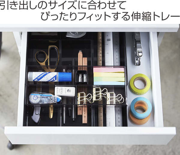 伸縮できるので、引き出しの奥行きに合わせてサイズを変更できます。仕切るための小さいトレイもあるから、使う文具に合わせて外すこともできます。