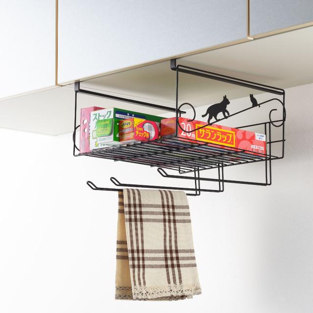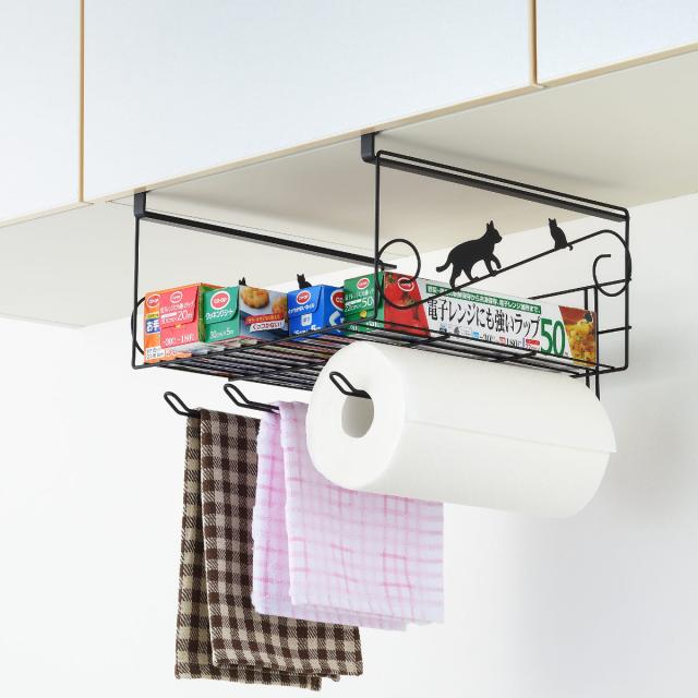 シックなネコのデザインがおしゃれな、吊戸棚下ラックです。吊戸棚下のスペースを利用して、使用頻度の高いラップ類やふきんなどをさっと手に取れる位置にまとめておけます。