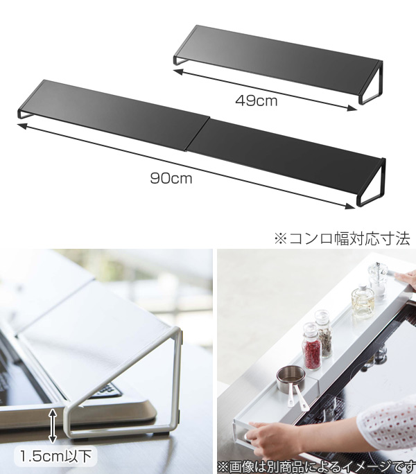 スライド式を採用したカバーは幅「約49cmから90cmまで」、高さ「約1.5cm以下」のビルトインガスコンロ、IHクッキングヒーターに対応したワイドタイプです。サッとスライドして伸ばすだけで、ご自宅のコンロサイズに合わせてピッタリ設置できます。